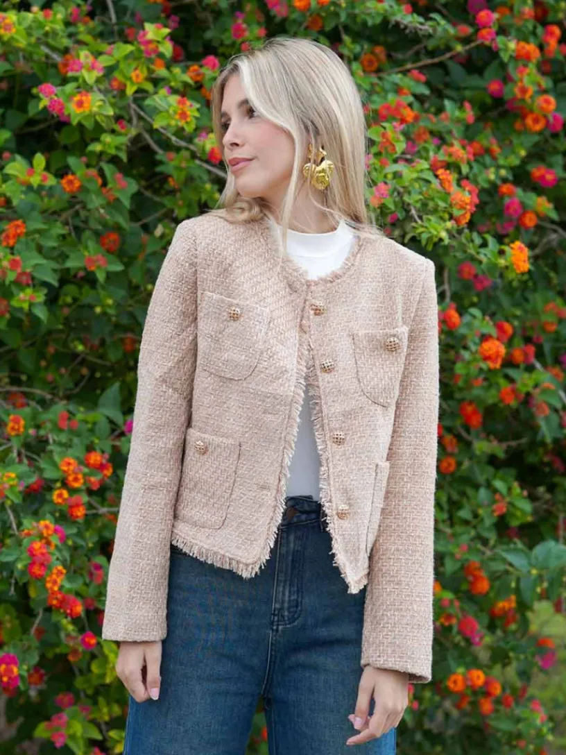 Chaqueta Tweed, en tono beige tostado, es una prenda clásica y elegante con estilo atemporal.