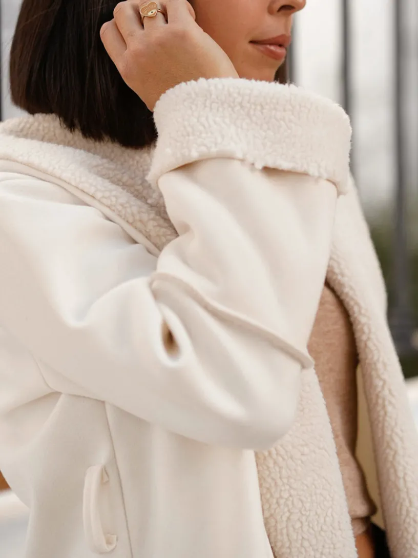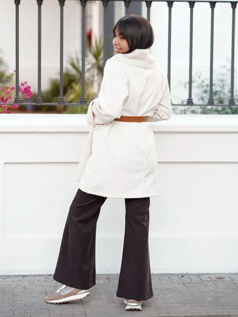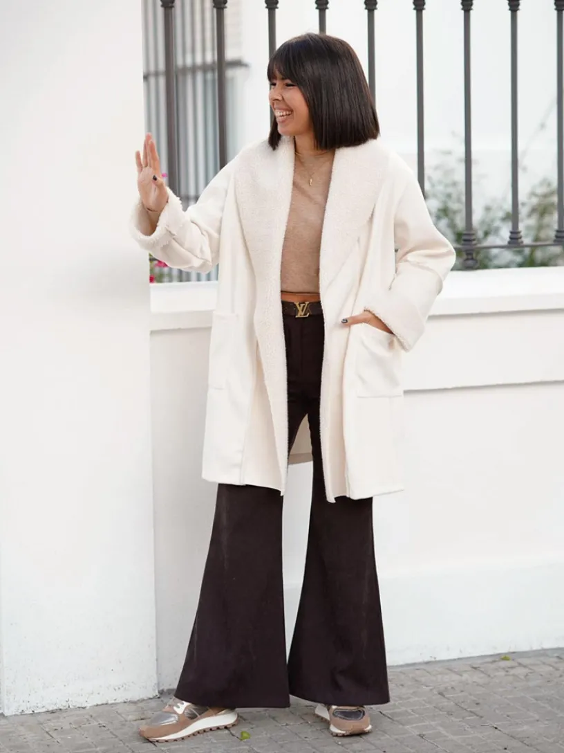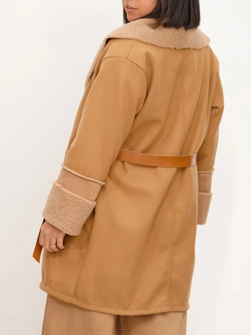 Abrigo Amaretto, perfecto para completar cualquier look con estilo y calidez. Este abrigo de doble faz destaca por sus solapas y puños en suave tejido de borreguillo, ofreciendo una mezcla de texturas y un toque distintivo al diseño.