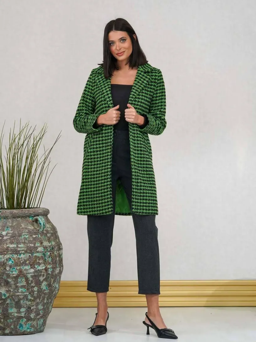 El Abrigo Pata de Gallo Verde es una pieza que reinventa el clásico estampado con una combinación vibrante en verde y negro. Confeccionado en un tejido estructurado, su diseño de corte recto y solapas clásicas lo convierten en una prenda que no pasa desapercibida.