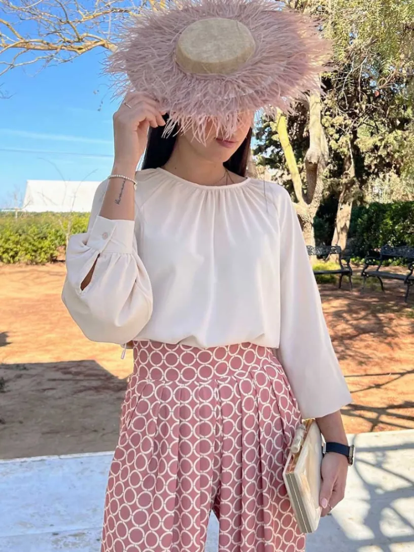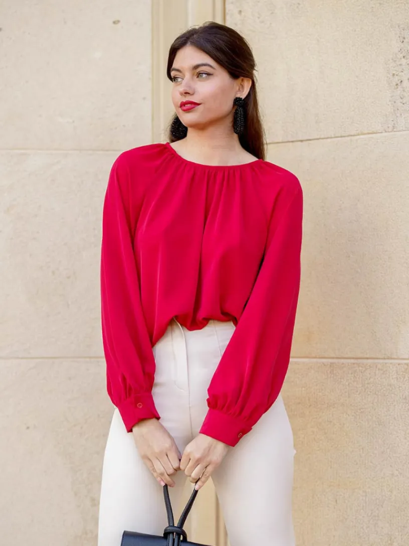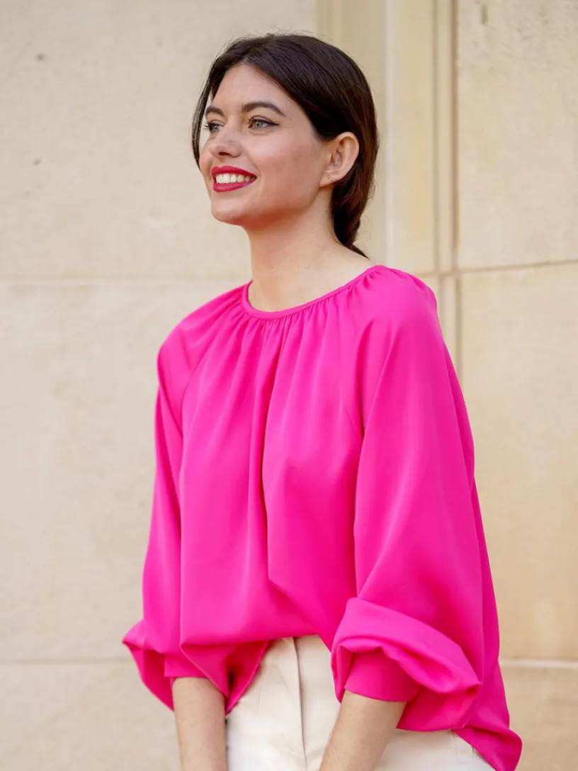 Esta blusa de mujer es sueltecita con una caída espectacular ya que va fruncida en el cuello, además, en la parte trasera del cuello tiene un pequeño botón. Su tejido es gustoso y fresco, por lo que te sentirás en las nubes con ella. La manga de esta blusa para mujer va rematada con un puño para una mayor comodidad.