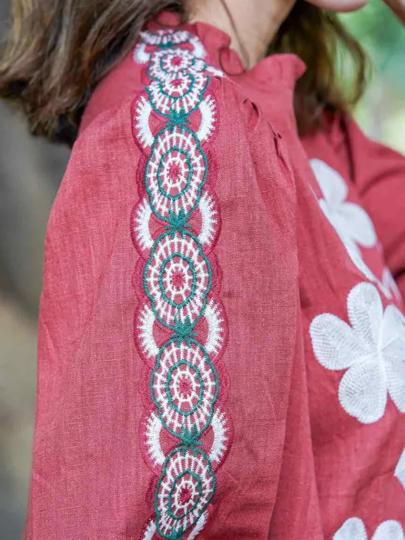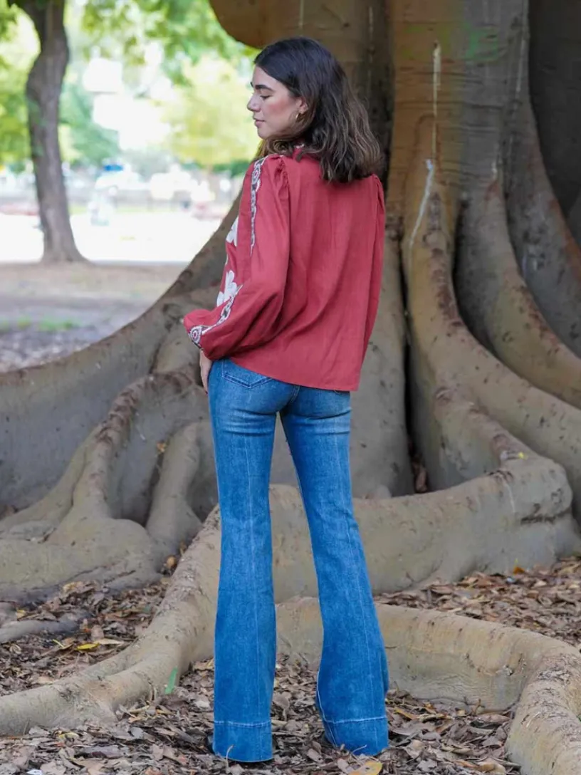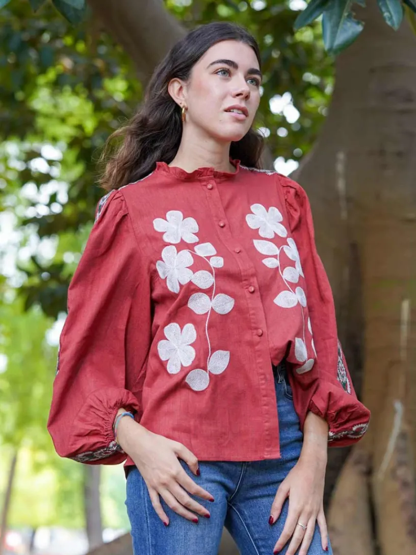 La Camisa Flores Bordadas es una prenda que destaca por sus detalles. Esta camisa de mujer presenta flores bordadas en tono beige en la parte delantera, creando contraste con el color teja de la camisa.