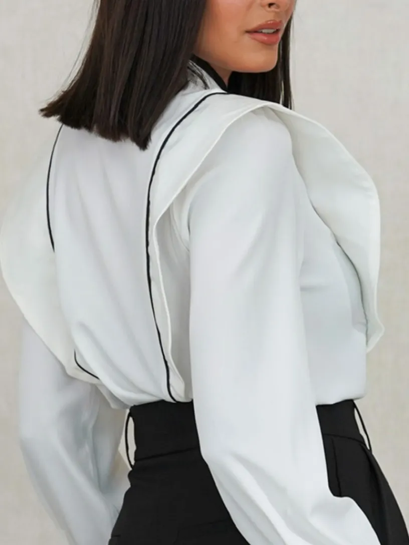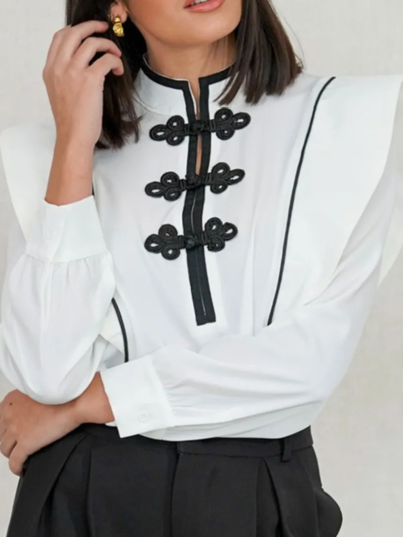 La Blusa Contraste Chines confeccionada en tejido 100% poliéster, esta blusa destaca por su diseño estructurado y detalles inspirados en la estética oriental. Su corte recto y mangas con volumen aportan sofisticación, mientras que las líneas de contraste en negro definen la silueta, creando un efecto visual moderno.