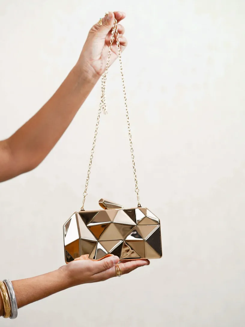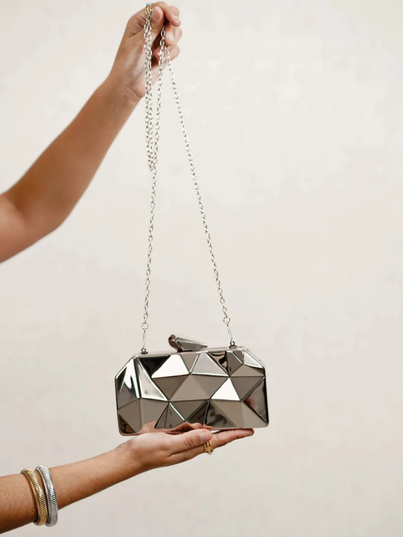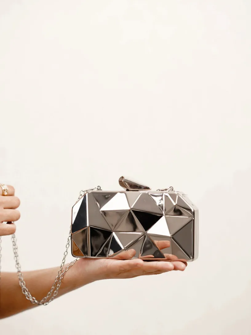 El Bolso Clutch Cubic es un complemento de fiesta que aporta una dosis de estilo a cualquier look. Disponible en elegantes tonos dorado y plateado, este clutch se presenta con un diseño asimétrico y geométrico que recuerda a una estructura cúbica.