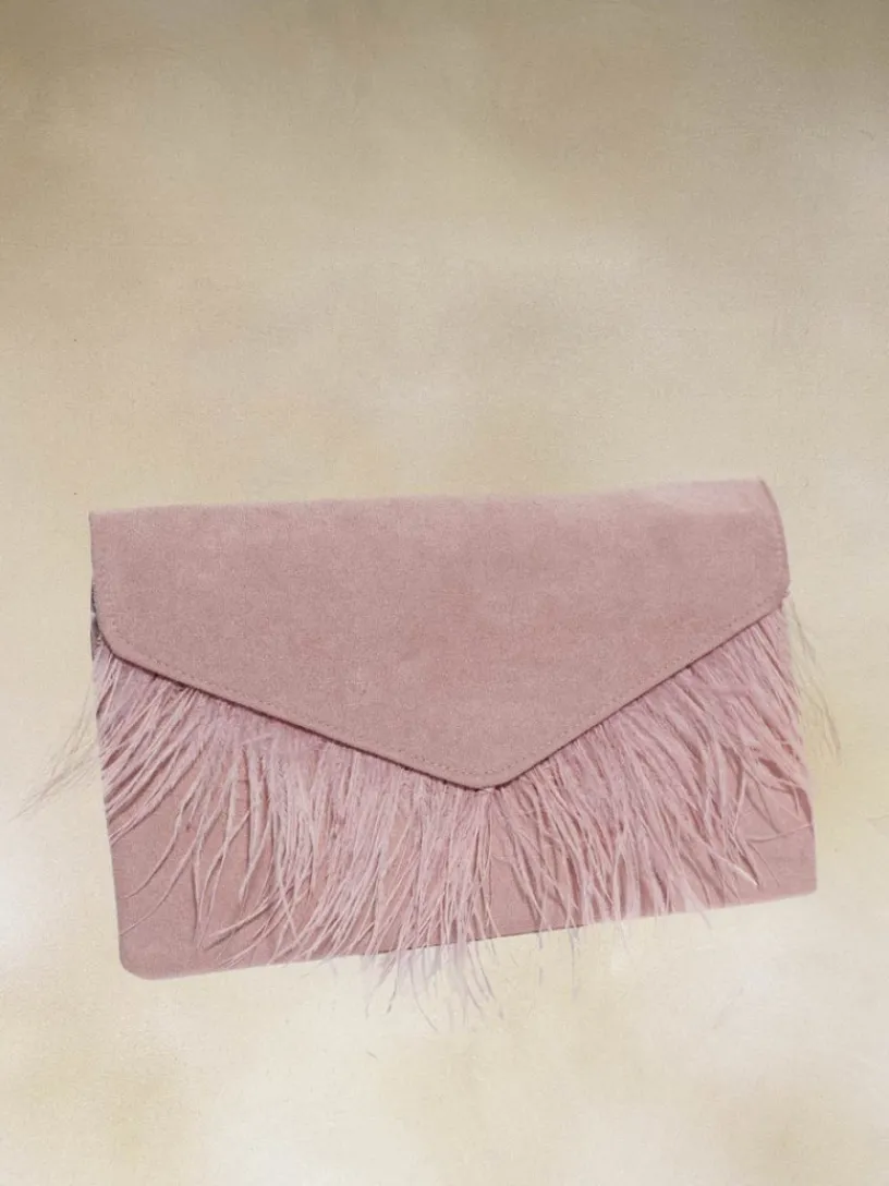 Nuestra cartera de invitada es de un tejido tipo piel de melocotón y su solapa va rematada con finas plumas que le darán estilazo a tu look. Dispone de una cadena en tono dorado para que puedas llevarla colgada de manera más cómoda. En su interior tiene un pequeño bolsillo que va cerrado con cremallera.