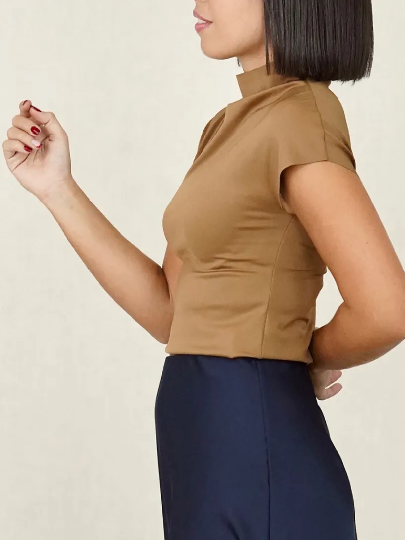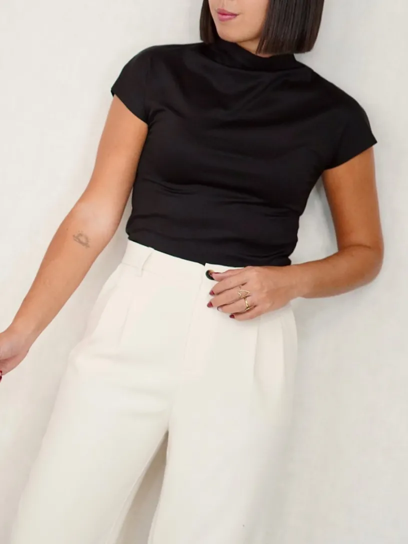 Tanto la parte delantera como la trasera presentan el mismo diseño, lo que resalta su sencillez y versatilidad. Además, su cuello perkins añade un toque chic, ideal para complementar cualquier look. Perfecto para vestir a diario o incluso con una falda en el fin de semana.
