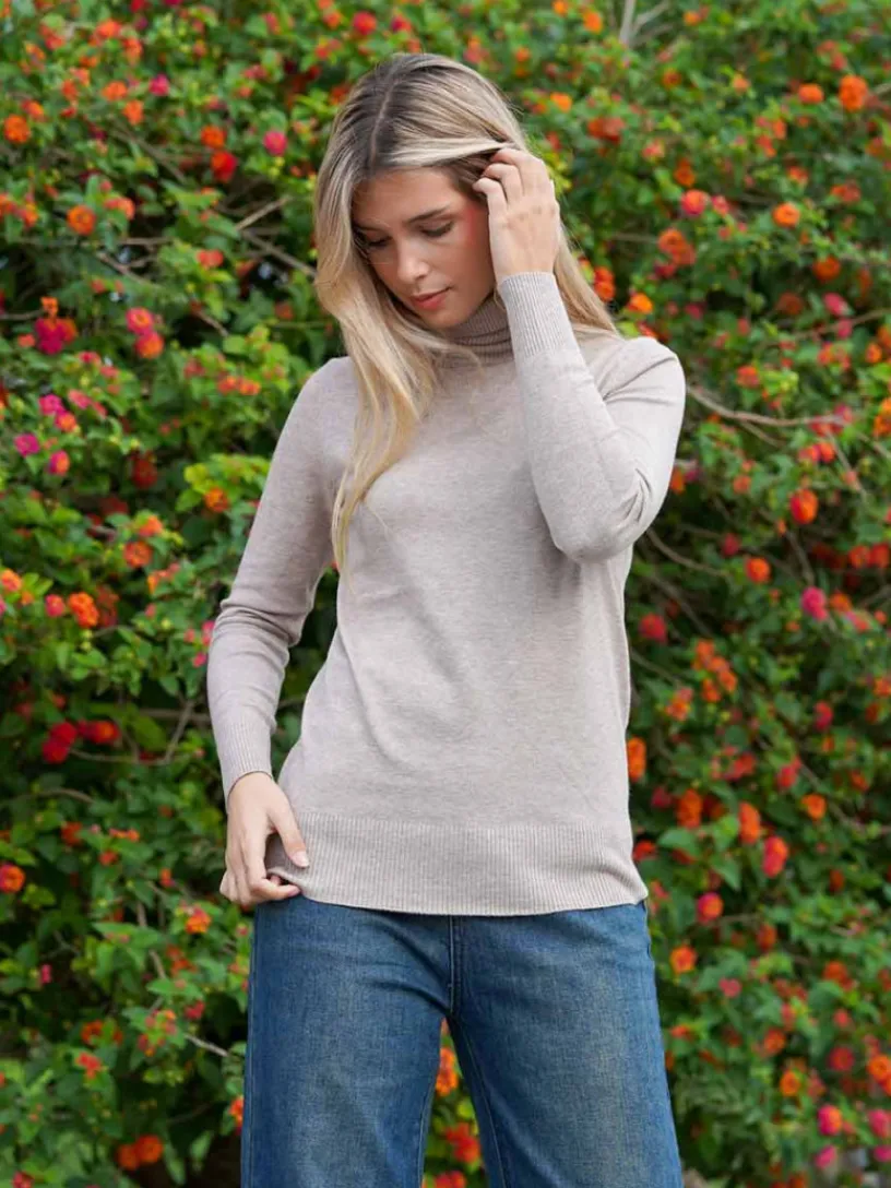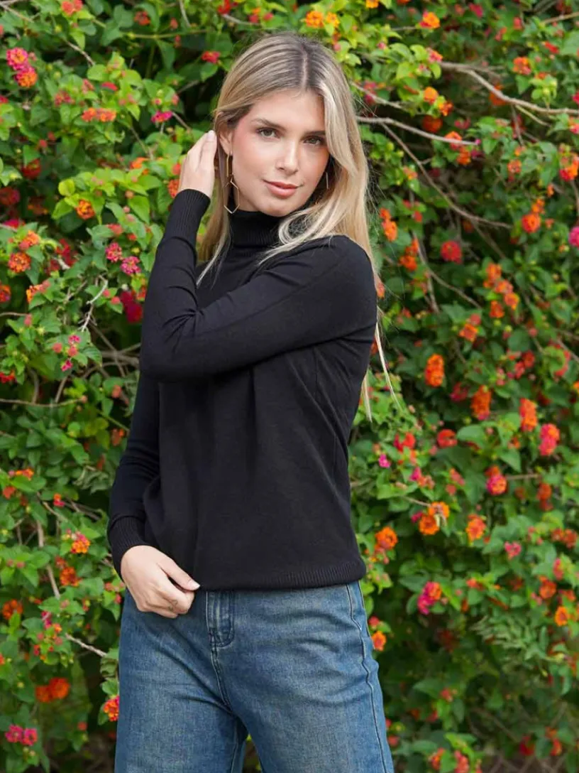 El Jersey Basic Cuello Alto es un imprescindible en el fondo de armario de cualquier mujer. Este jersey de cuello vuelto es perfecto para vestir a diario, aportando comodidad. Su diseño versátil permite combinarlo bajo un traje de chaqueta para un look chic, o llevarlo bajo otro jersey, protegiendo tu cuello del frío.