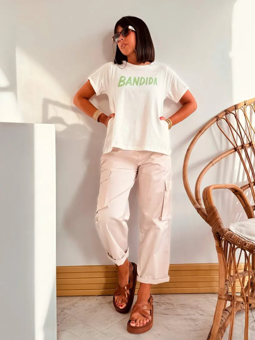 Camiseta blanca de mujer fabricada en tejido de algodón con estampado print de texto en la zona delantera con la palabra Bandida en tono verde. Con cuello redondo ribeteado y manga corta con vuelta.