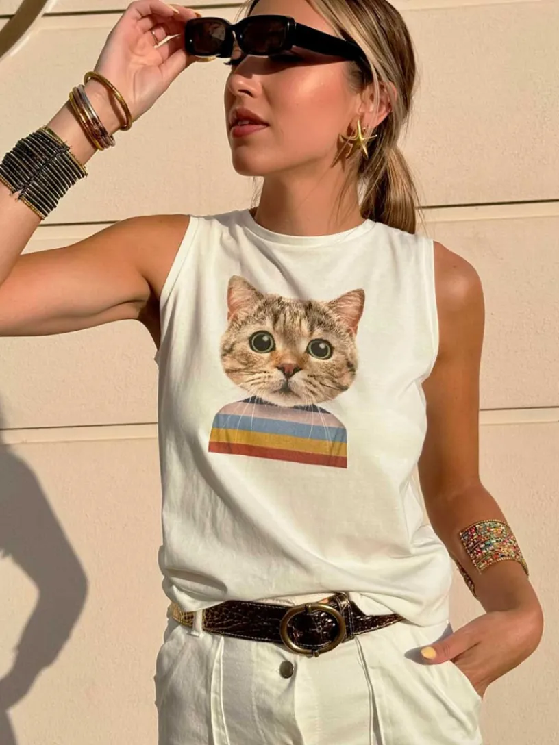 Camiseta Sin Mangas Print Gato, una camiseta de algodón de color blanco con estampado delantero de un gato con camiseta de rayas de colores que harán que combine con miles de looks.