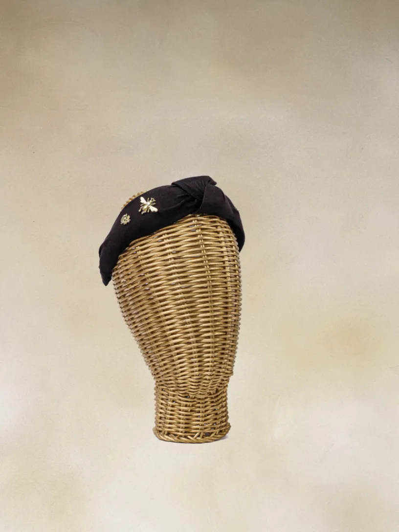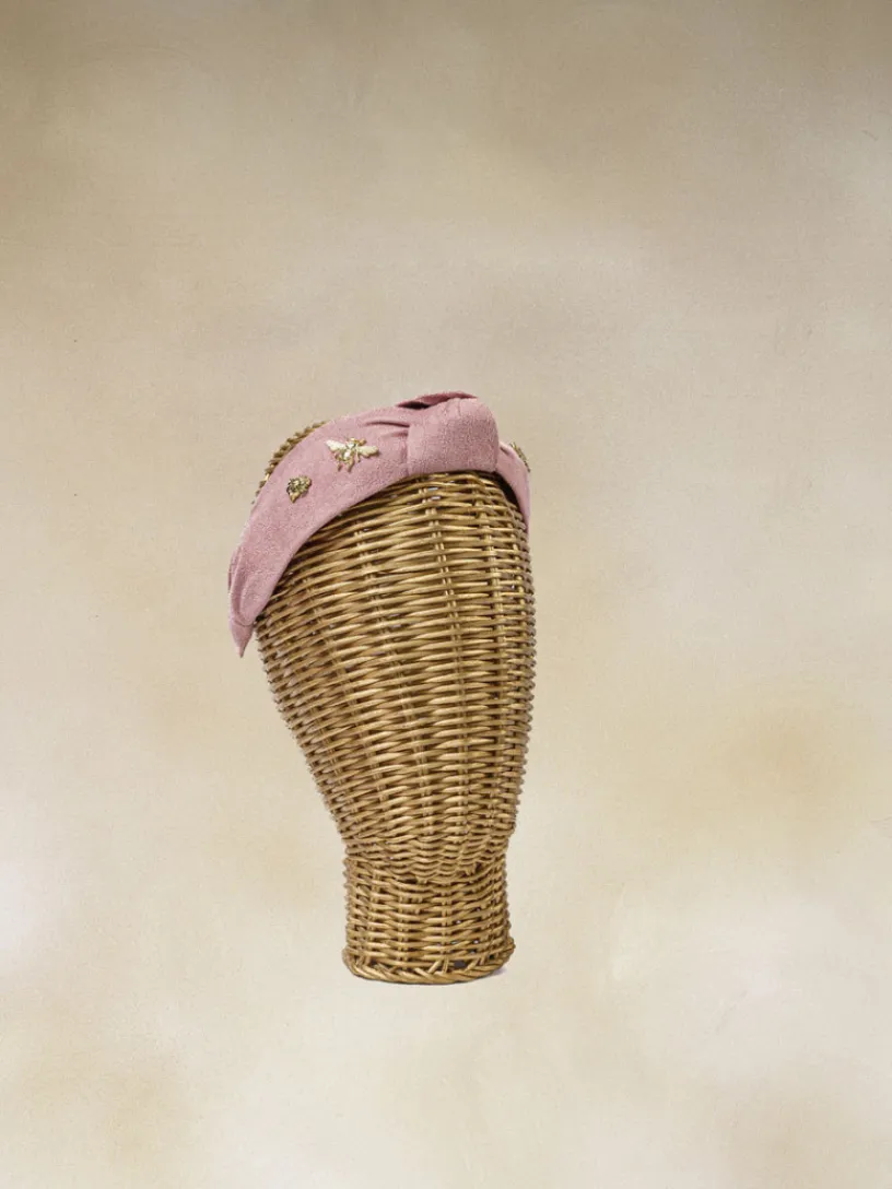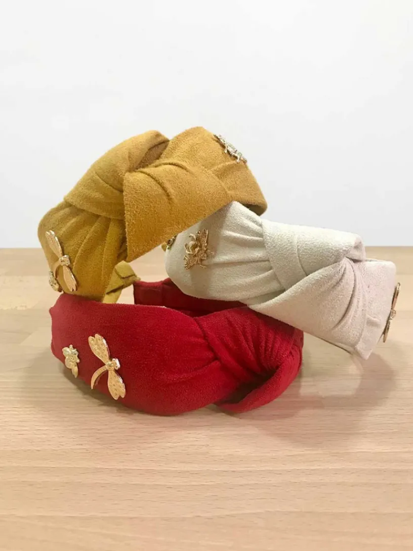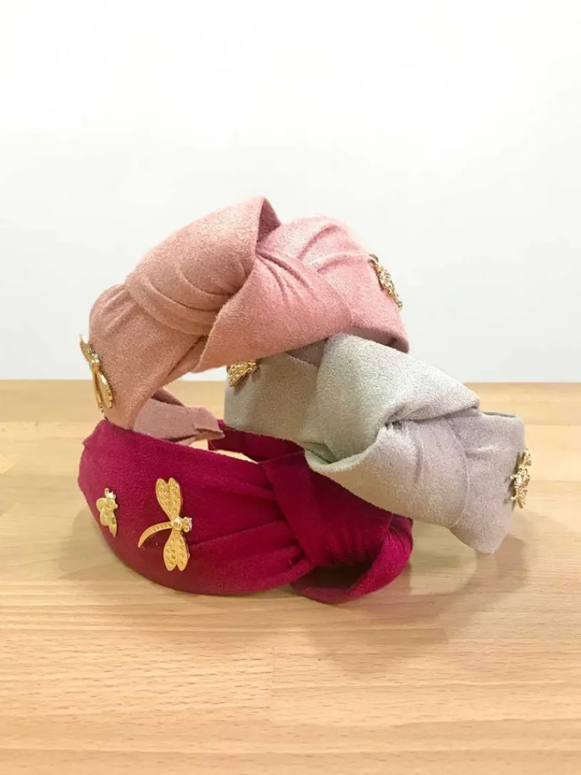 La diadema de antelina incorpora un nudo que queda en el centro de la cabeza, y a sus dos lados, tiene bichitos de metal dorados que le aportan un toque muy chic. ¡No te quedes sin ella!