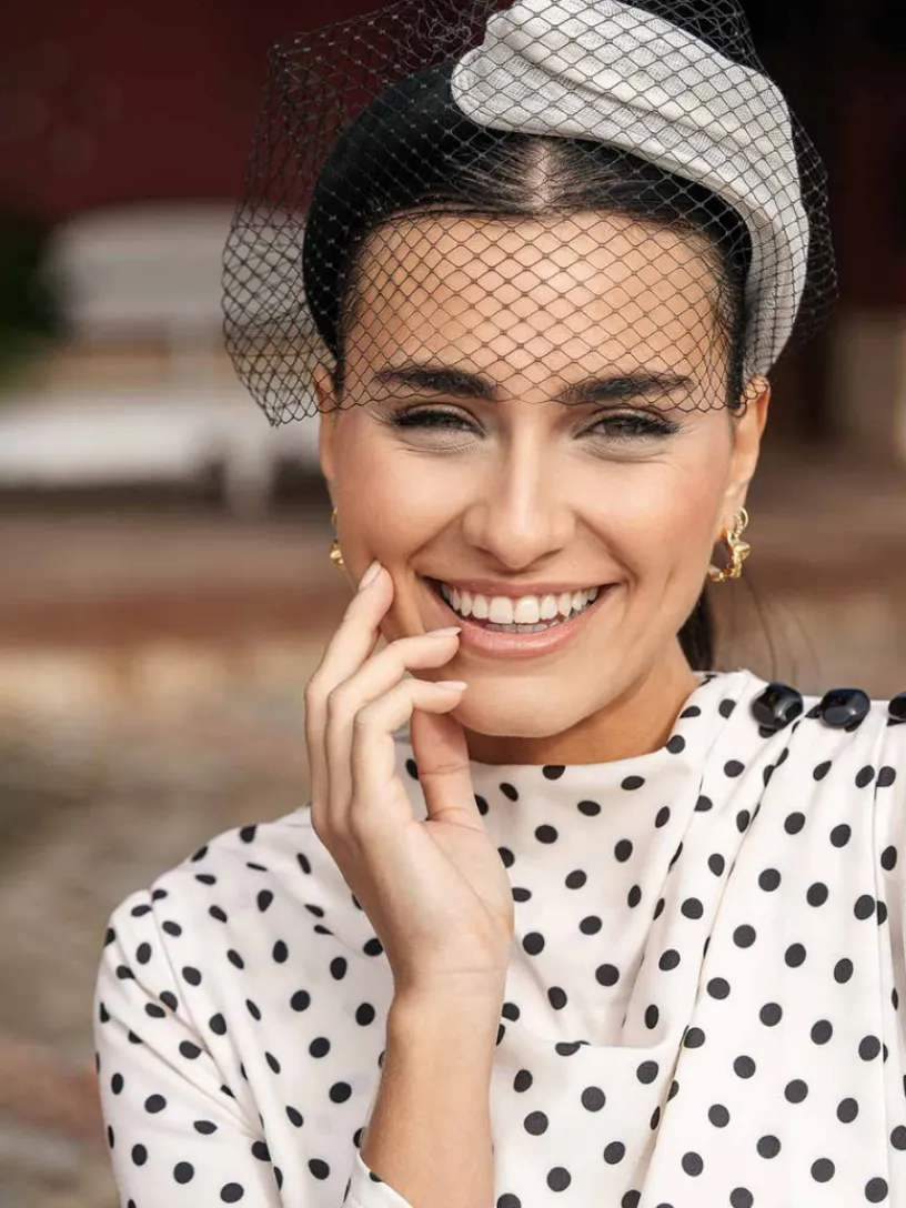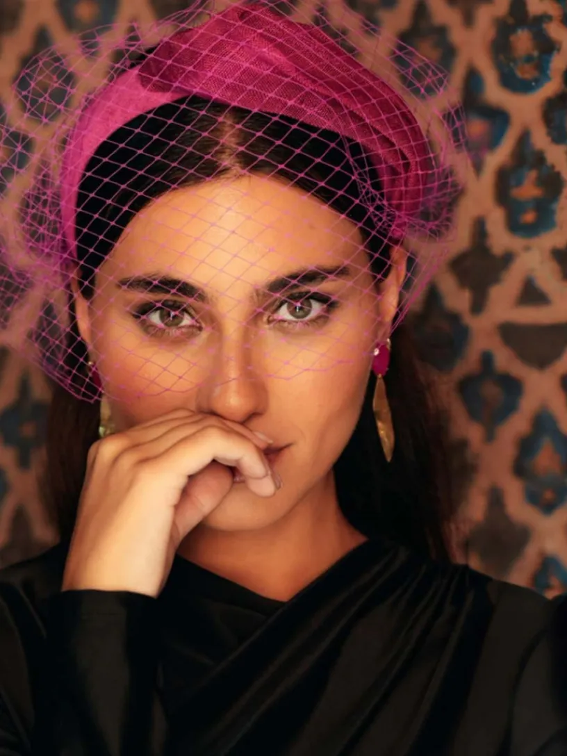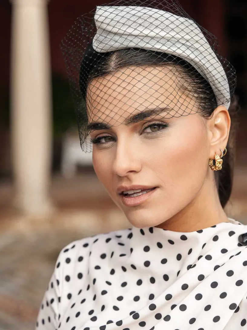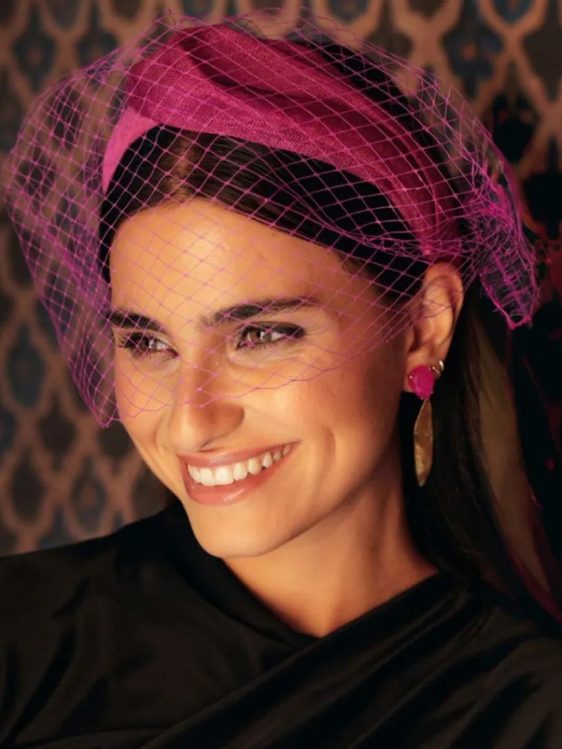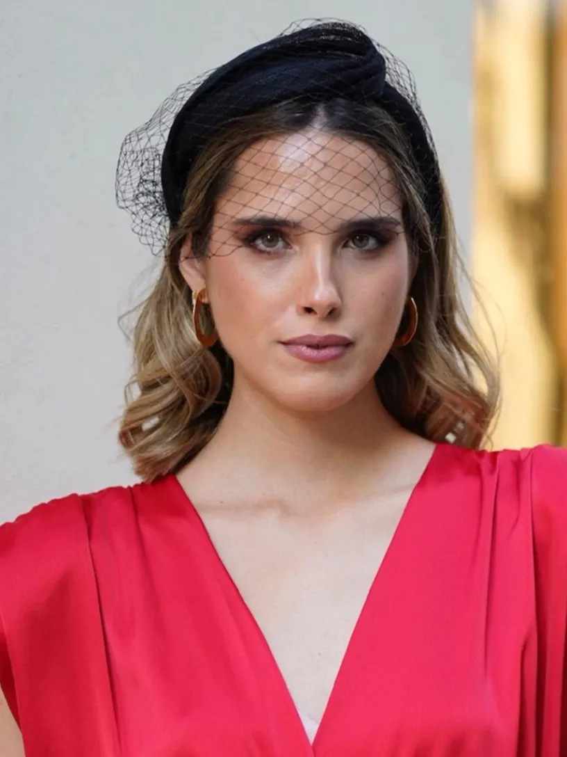 Confeccionada sobre base rígida que garantiza su sujeción y confort, detalle en sinamay, destacar el detalle de su redecilla o velo de tocados que podrás elegir llevarlo hacia adelante, rozando la mirada, o situarla de forma más discreta hacia atrás.