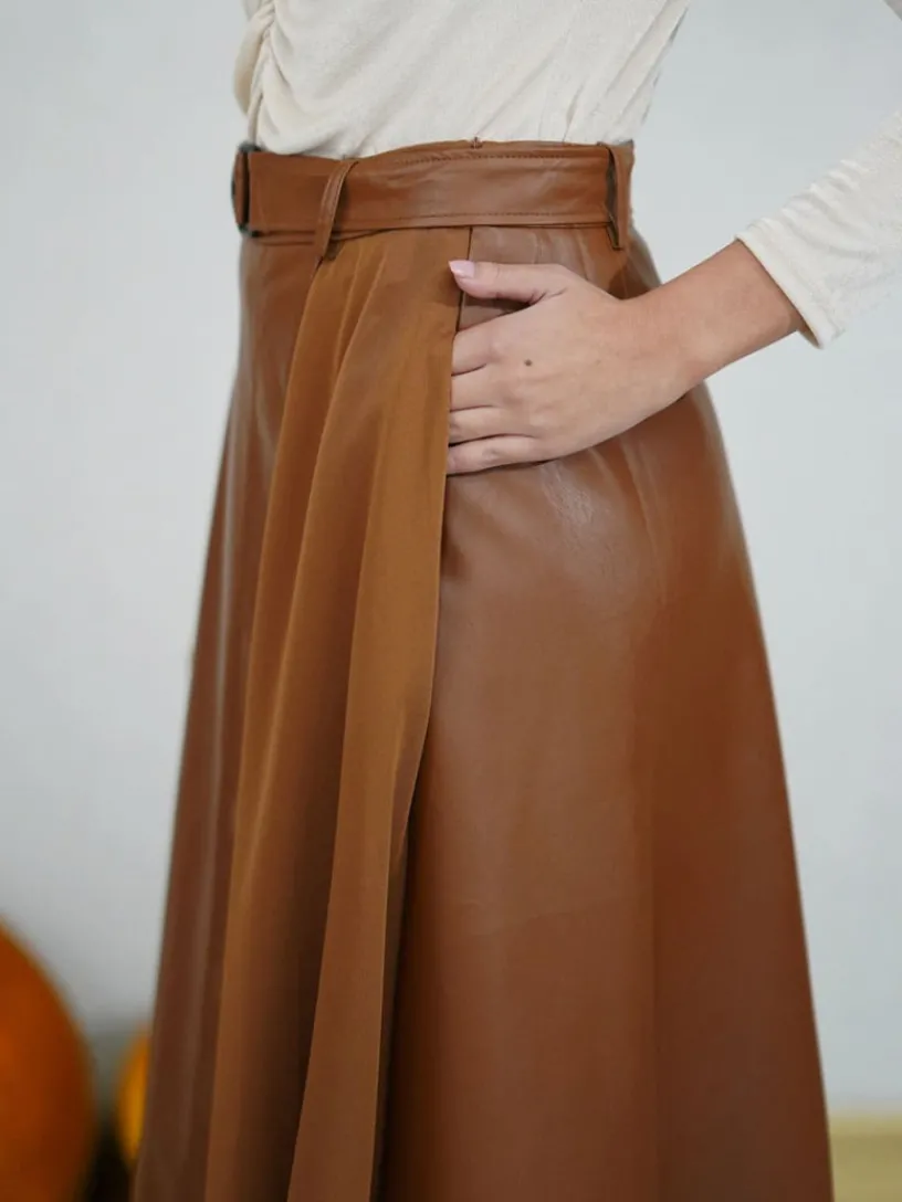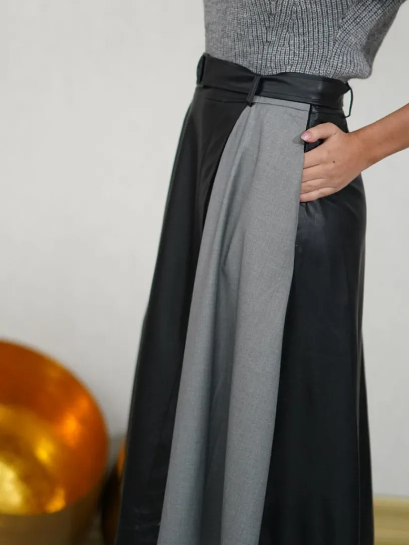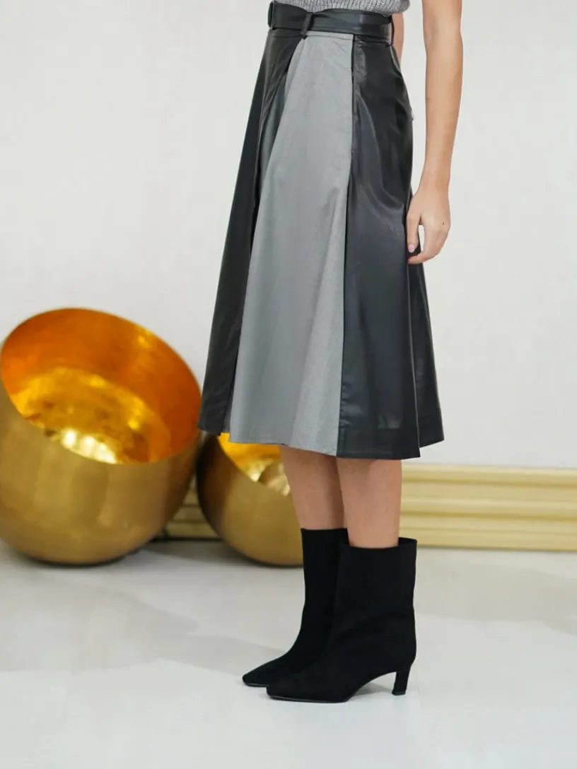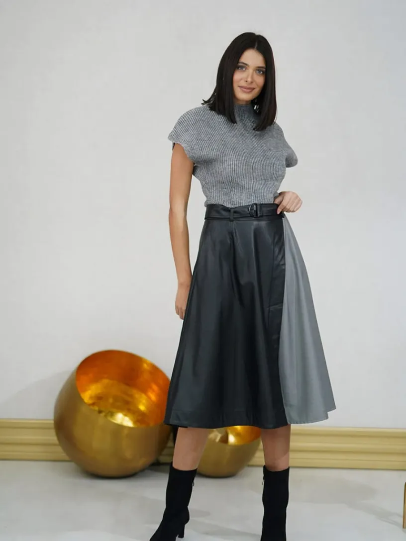 La Falda Bicolor Luxe es una prenda atemporal que eleva cualquier look con su diseño moderno. Confeccionada en un tejido de polipiel suave, su textura aporta un acabado pulido. El diseño bicolor en tonos complementarios crea un contraste visual único, ideal para destacar en cualquier ocasión.