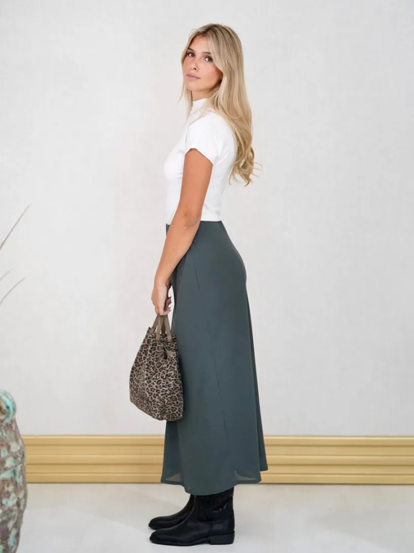 ¡La Falda Lencera Catiónica es la prenda que tu armario necesita esta temporada! Confeccionada en tejido de gasa, esta falda midi destaca por su fluidez y ligereza, además de contar con un forro interior para asegurar que no transparente nada, ofreciéndote comodidad y confianza en todo momento.