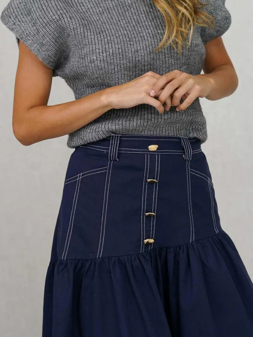 La Falda Vaquera Botones destaca por su diseño original. Su corte midi se ajusta en la zona superior, realzando la figura, y se abre en la parte inferior para un toque fluido y elegante. Los botones dorados en la parte delantera añaden un detalle chic, mientras que los bolsillos laterales proporcionan un aire desenfadado.