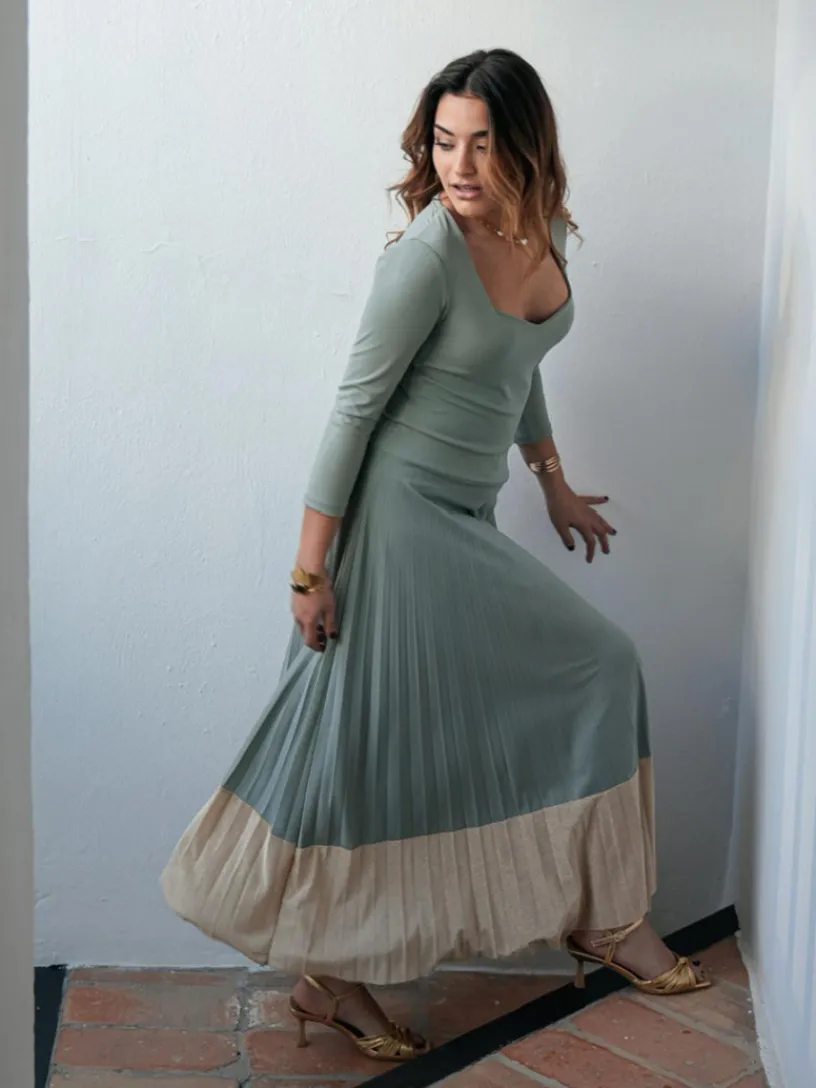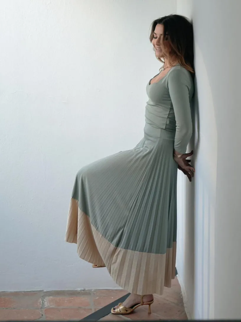 Consta de dos piezas, una falda midi con diseño plisado que aporta fluidez al caminar. Su cinturilla es engomada para que se adapte mejor a tu figura, y, como detalle en el bajo lleva una amplia raya dorada que la hace más combinable y chic.