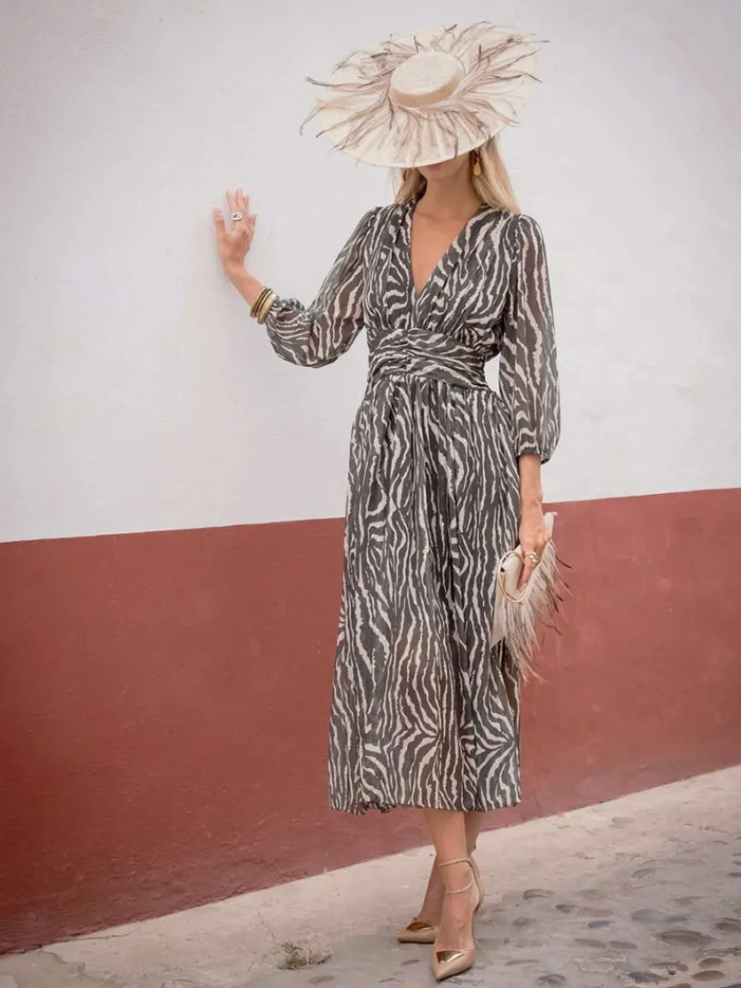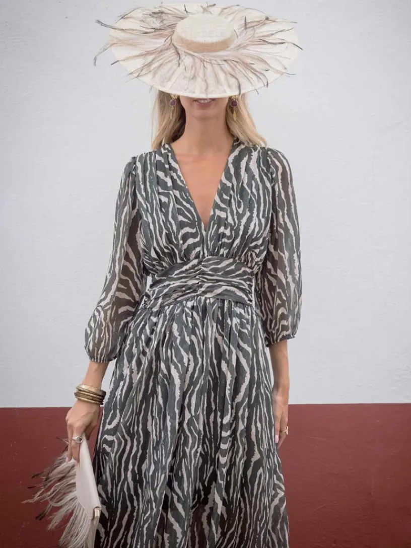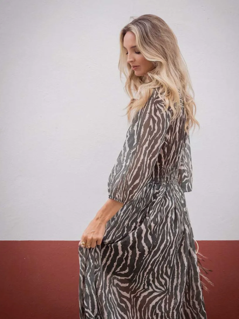 Vestido Arenisca, un vestido midi confeccionado en tejido de gasa con estampado de cebra en tonos verde caqui y beige.