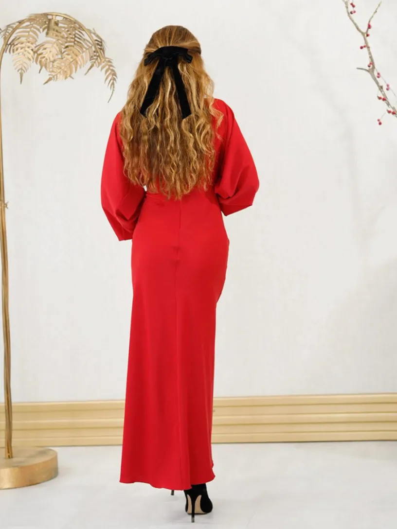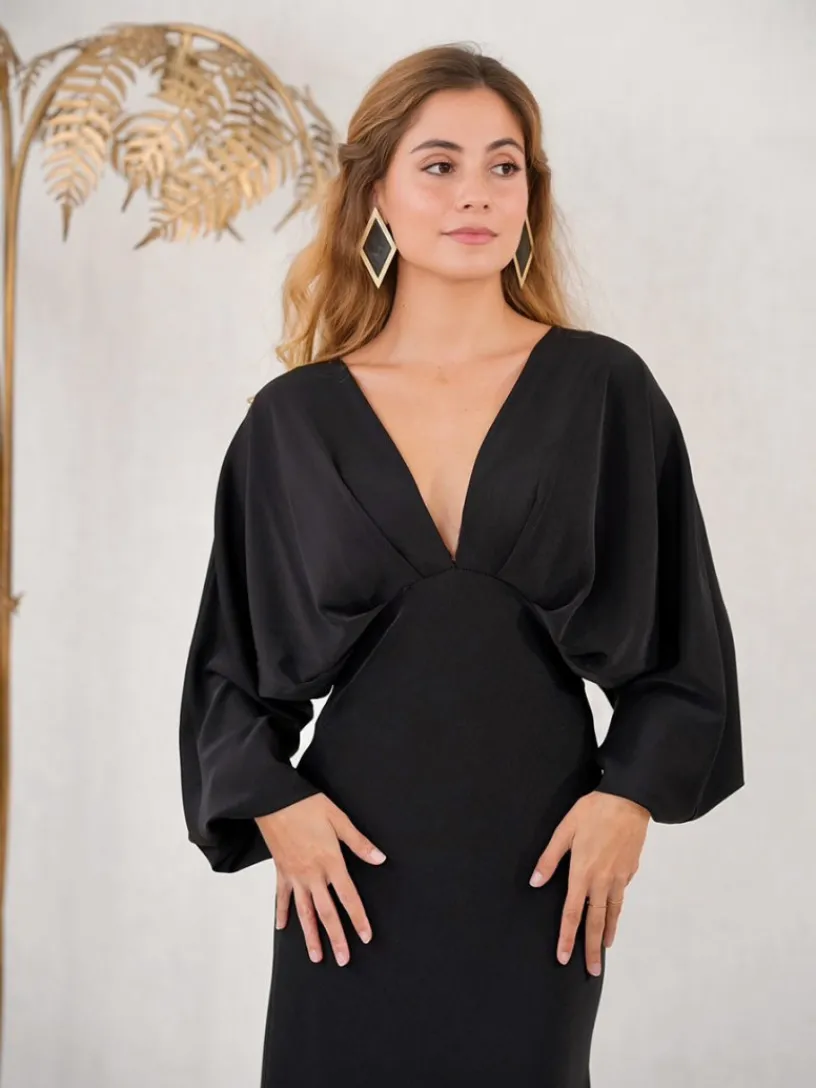 Con diseño de mangas largas, amplias y fluidas, que terminan en un delicado engomado en el puño. Su escote en V realza la figura con sutileza, mientras que la zona superior del vestido presenta un corte más holgado, asegurando comodidad. Cerrado con una cremallera trasera invisible.