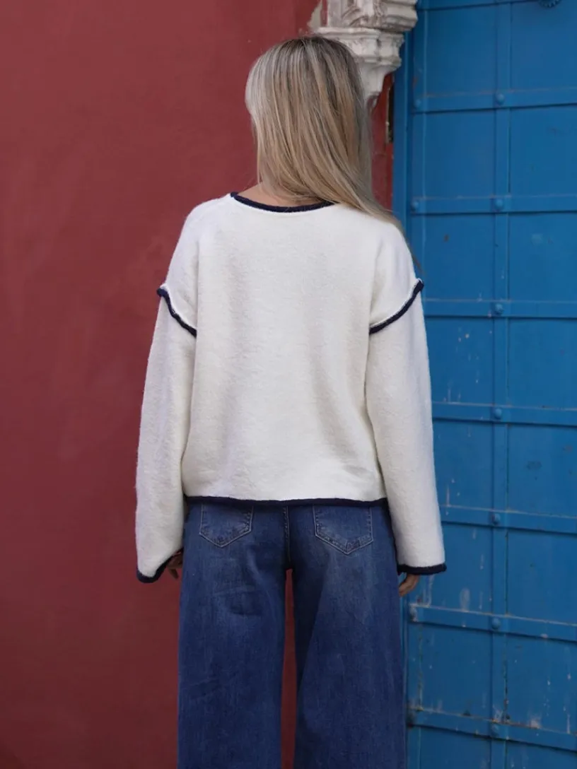 Confeccionado en tejido de punto beige con contraste de detalles en negro en el cuello y las mangas que aportan un toque ideal. Perfecto para combinar con tus jeans a diario, este jersey le dará un toque dulce y original a tus días.