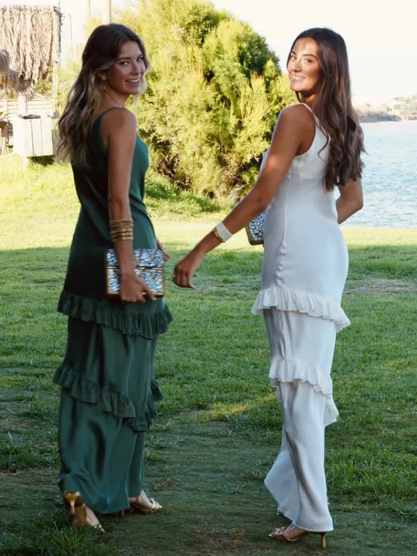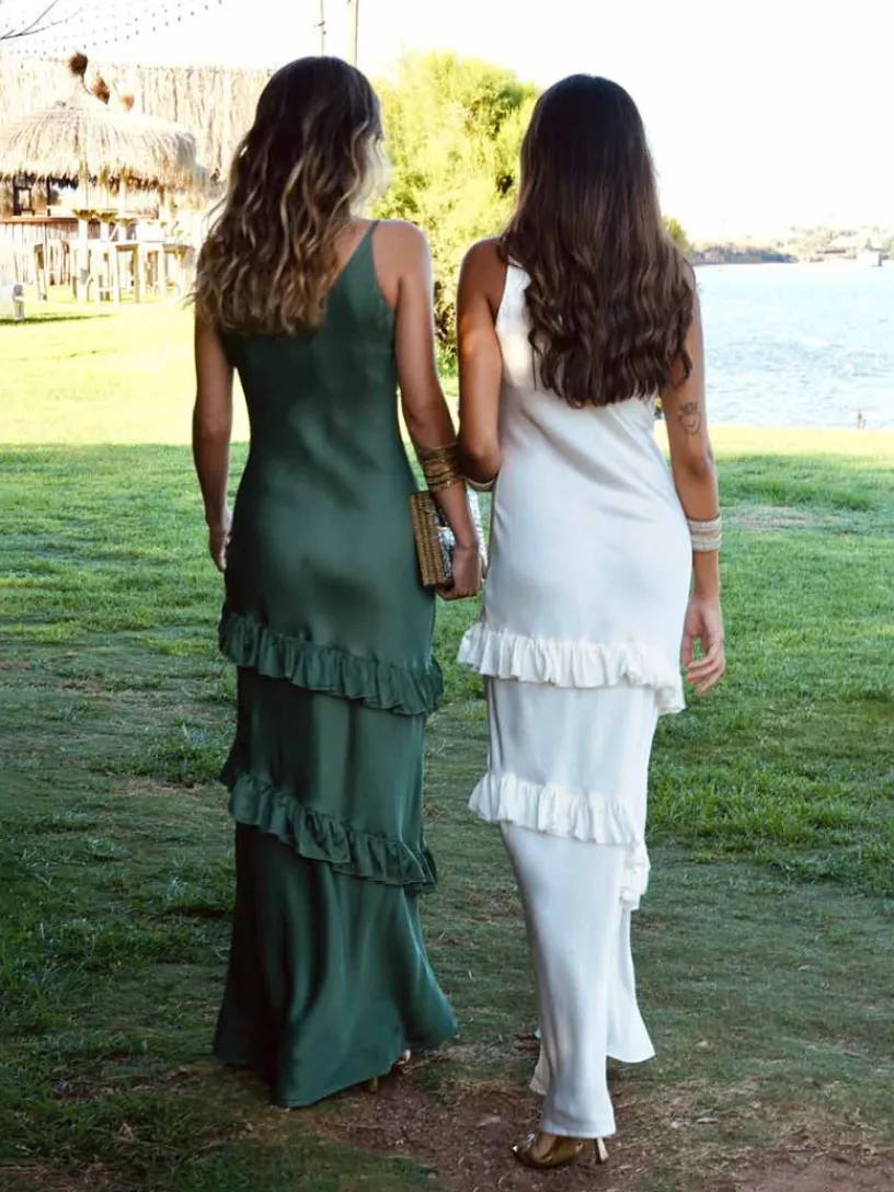 El Vestido Cascada Volante es la elección perfecta para quienes buscan elegancia y estilo en una prenda versátil. Este vestido largo, de tipo lencero, está confeccionado en tejido de viscosa satinada que le aporta un brillo sutil y una caída fluida, ideal para cualquier ocasión especial.