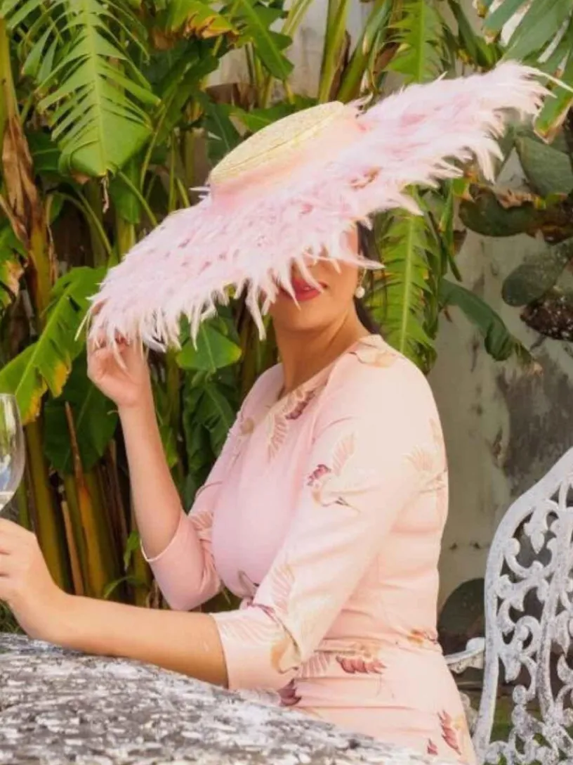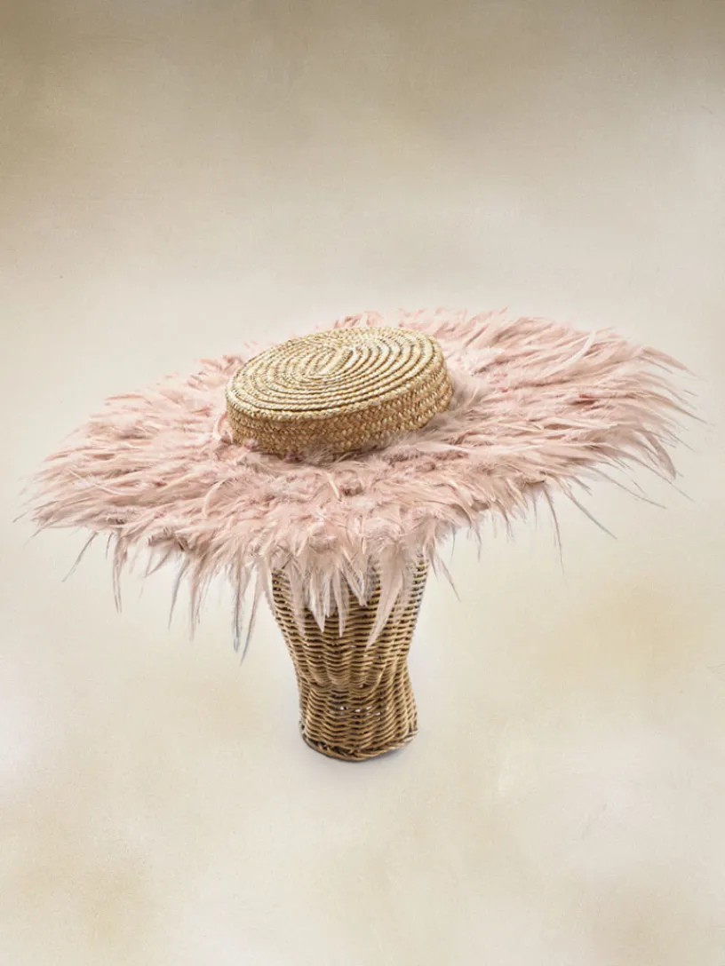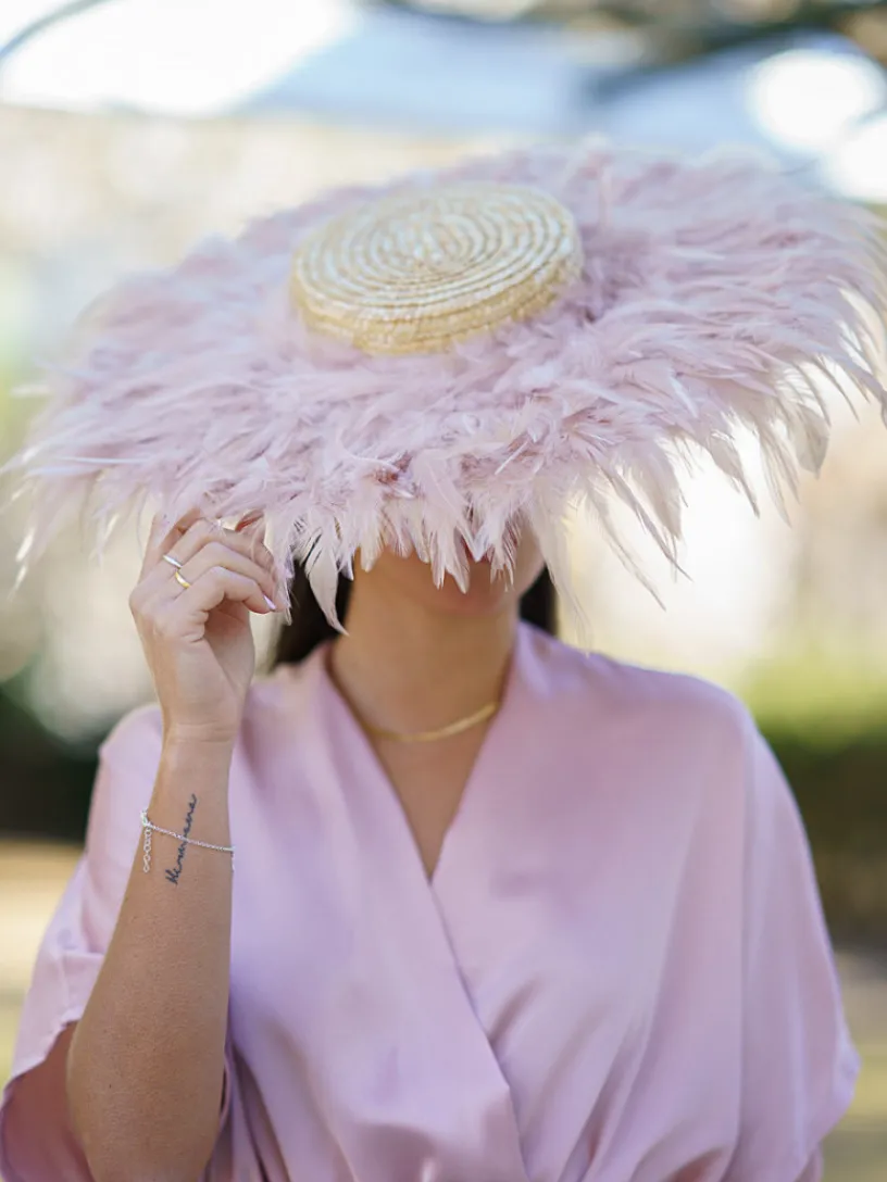 Es una pamela de canotier de ala ancha forrado de plumas en la zona exterior. Tiene una diadema que se ajusta al cabello para mayor comodidad y colocación del tocado. Un diseño elegante y sofisticado para ser la invitada perfecta de tu próximo evento. Este bonito tocado es el complemento perfecto para vestidos de largo midi en bodas de día.