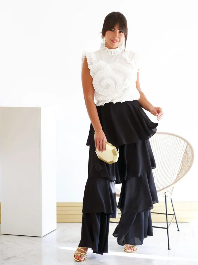 Nuestro pantalón de volantes va cerrado con una cremallera invisible en el lateral izquierdo. Sus volantes, que rodean toda la pierna, le dan un toque único y llamativo y así… ¿Quién no se anima a bailar?