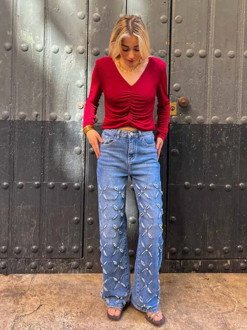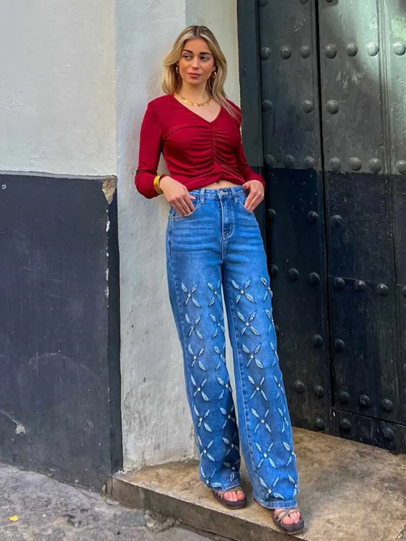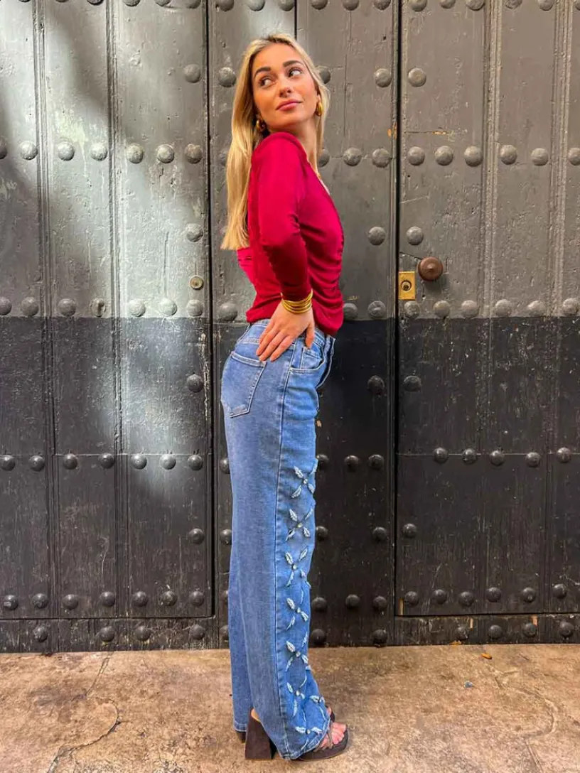 Pantalones vaqueros de mujer confeccionados en tejido con algodón, con diseño de corte recto y como detalle, flores aparentemente rotas en el pantalón. Cerrado con cremallera y botón en la zona delantera, y además, tiene trabillas por si quieres combinarlo con un cinturón.