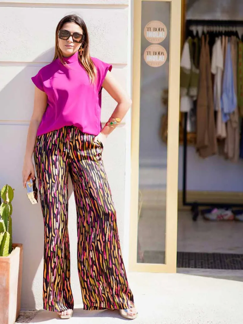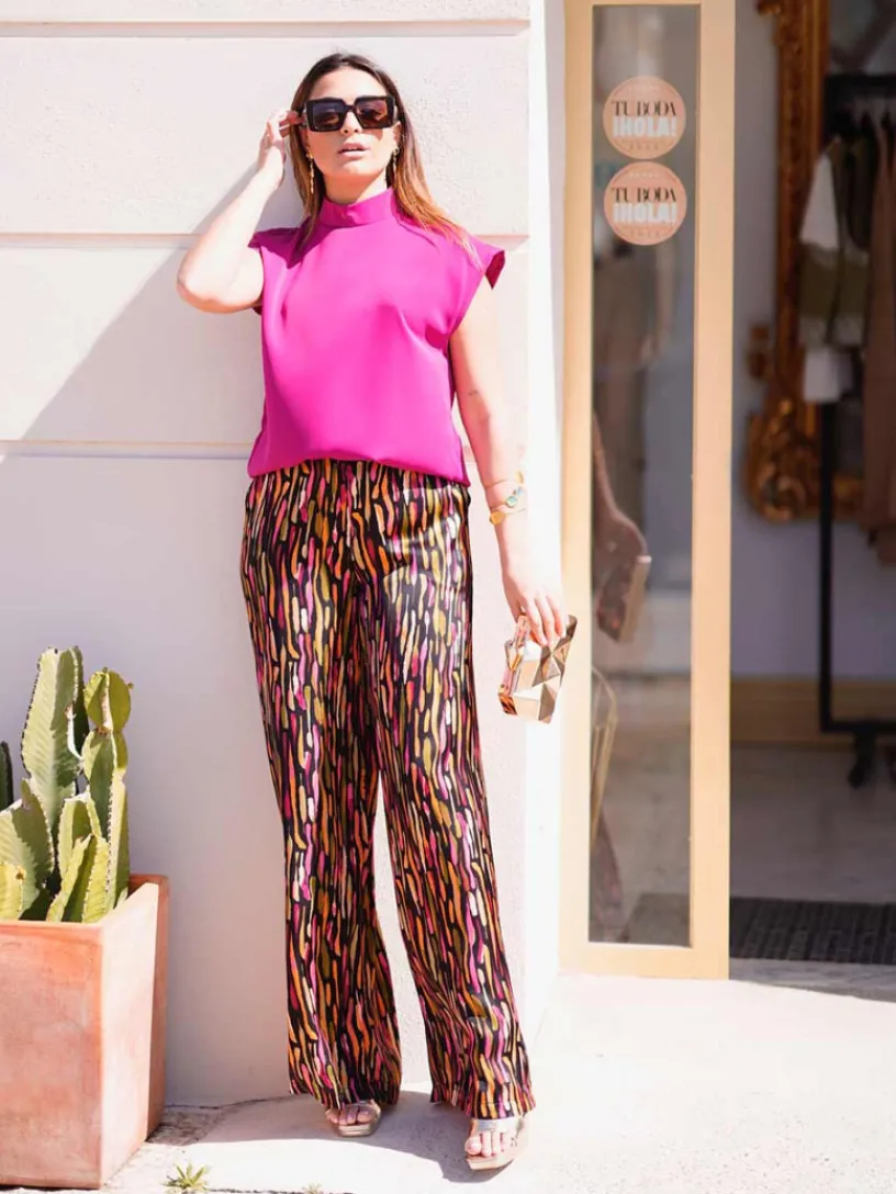Combina nuestro pantalón estampado con una blusa y zapatos de tacón y tendrás un total look ideal.