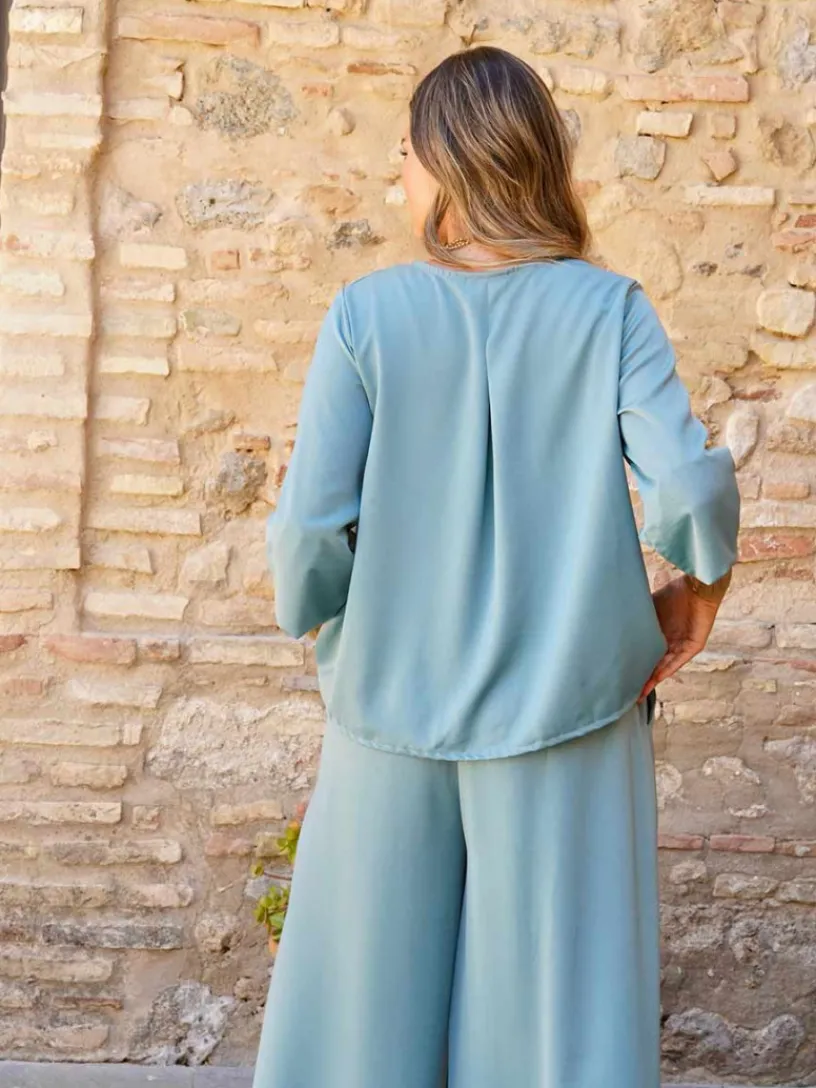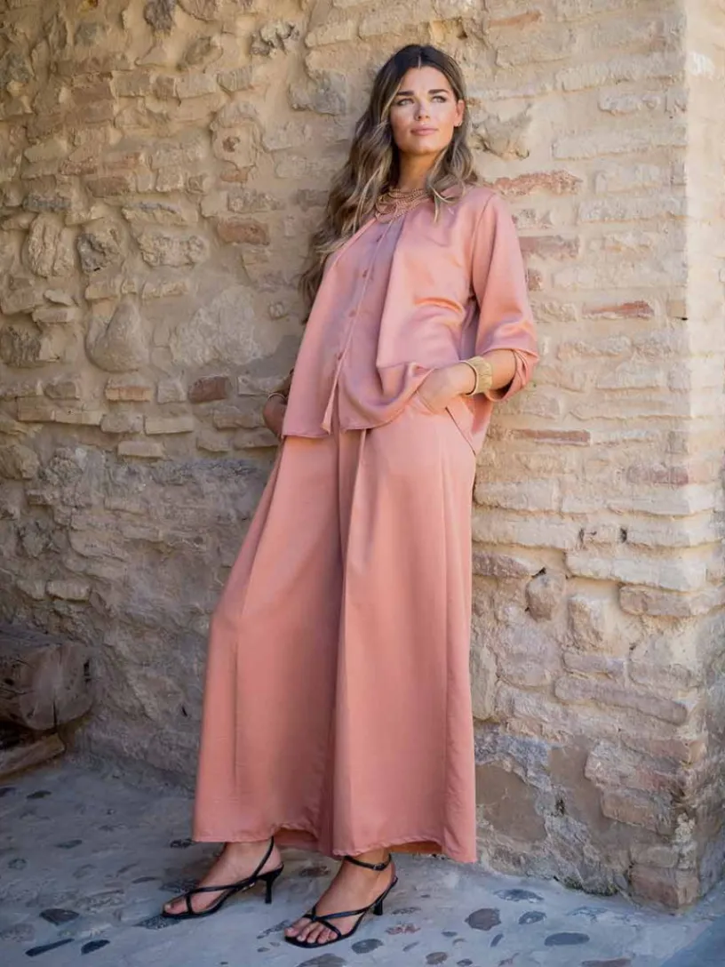 El pantalón palazzo complementa perfectamente la camisa con su corte amplio que estiliza la figura, mientras que la cintura trasera engomada garantiza un ajuste cómodo. Los bolsillos laterales añaden un toque desenfadado al conjunto. Es una opción versátil tanto para el día a día como para momentos más especiales.