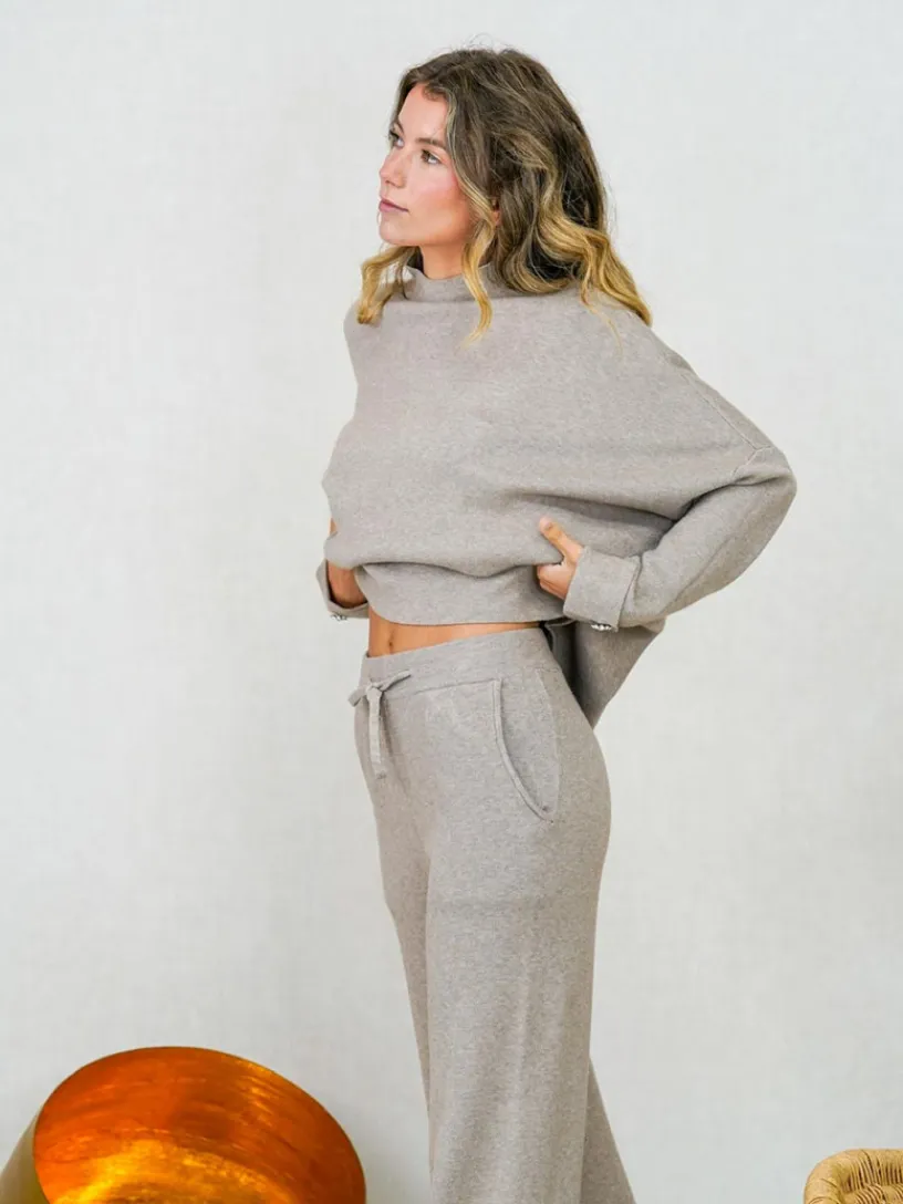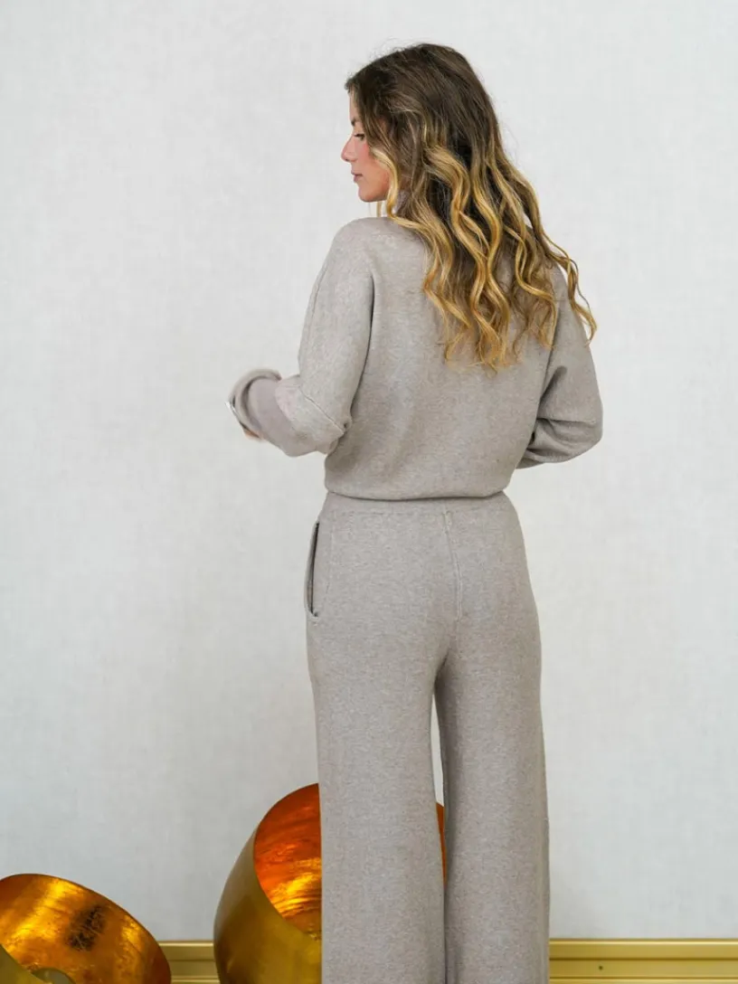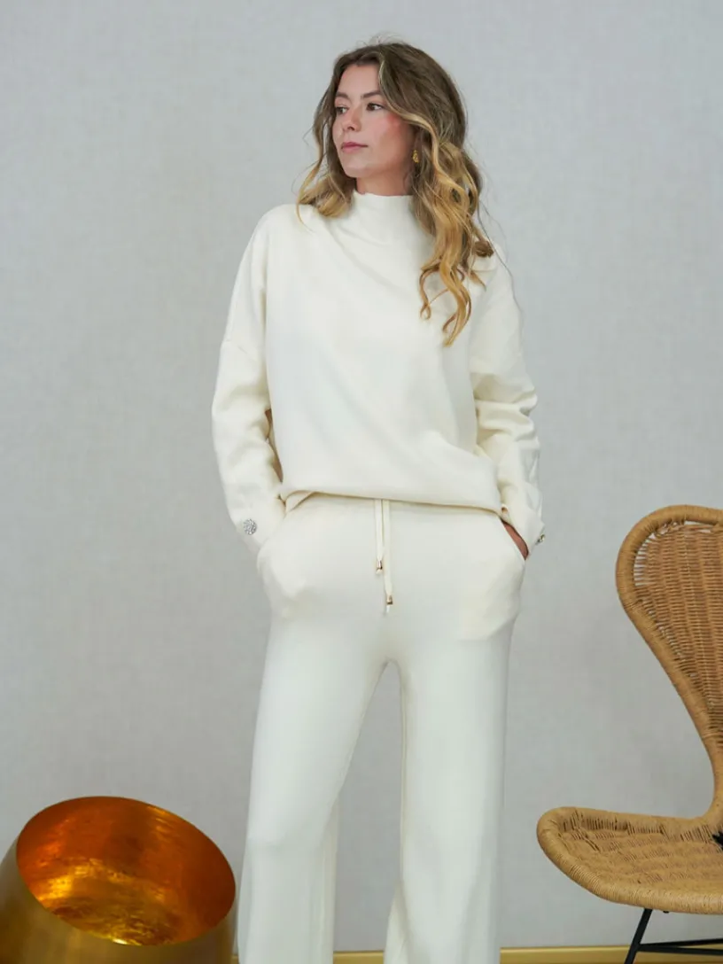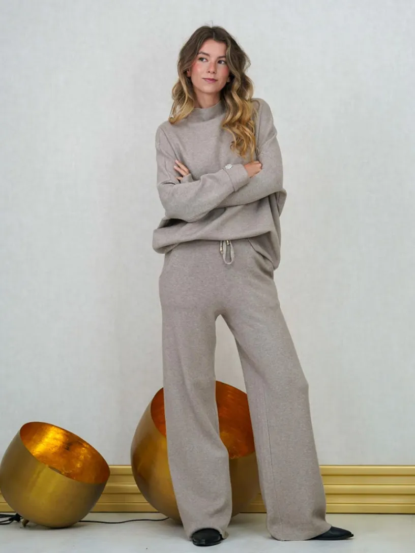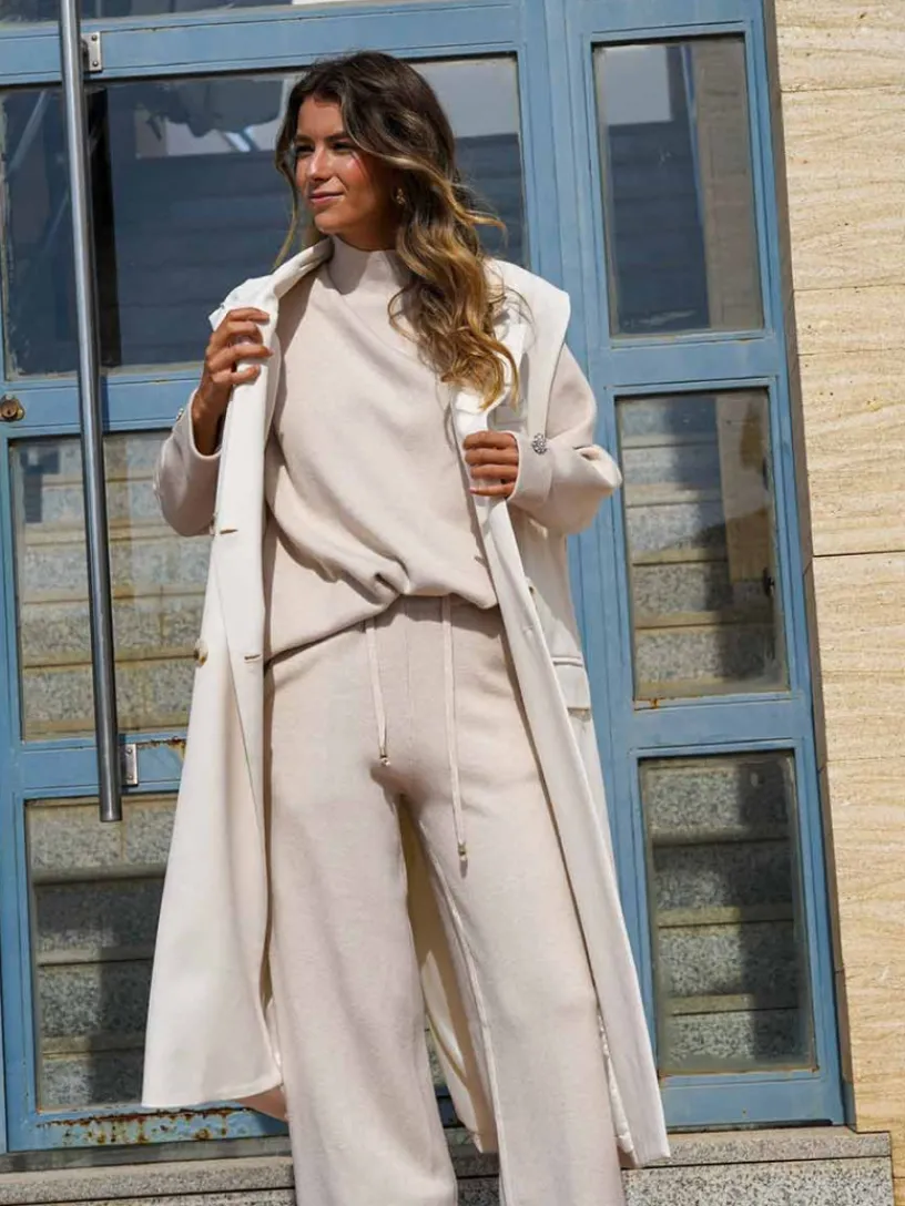 El jersey presenta cuello perkin y un detalle de abalorio de pedrería en el puño, que le da un toque chic. El pantalón, de pierna ancha, cuenta con bolsillos y cintura engomada con cordones ajustables, aportando un aire desenfadado.