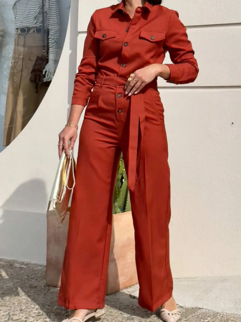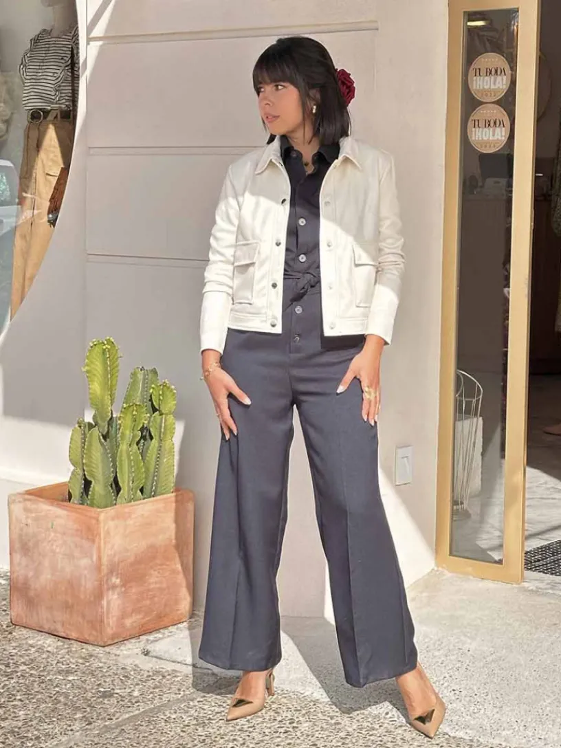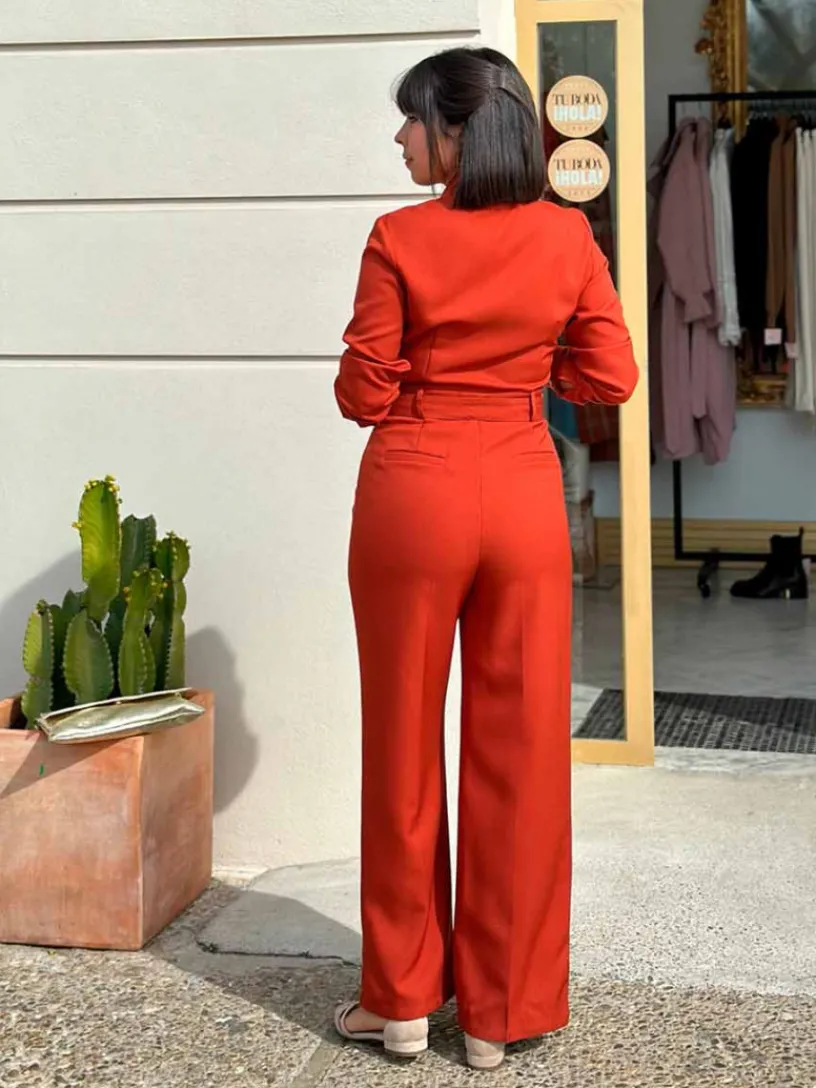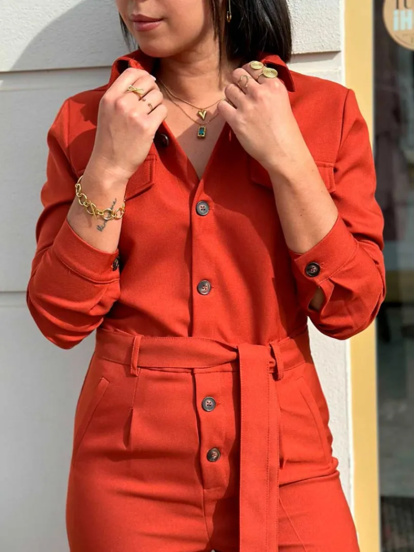 Disponible en dos tonalidades, azul marino y tono teja. El corte favorecedor del mono realza la figura de manera elegante y cómoda. Los cuellos clásicos de solapa agregan un toque chic. La simplicidad y la versatilidad del diseño permiten que el mono se adapte a diversas situaciones, desde quedadas especiales hasta salidas informales.