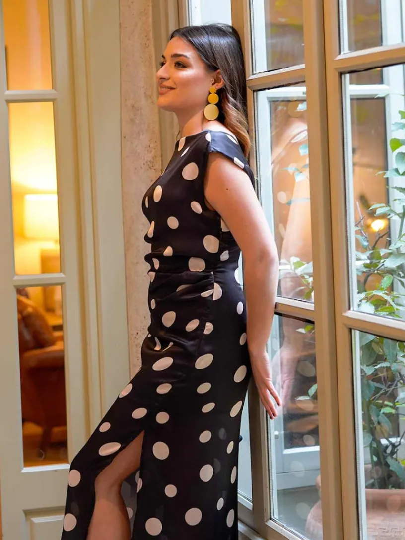 Vestido midi confeccionado en tejido de gasa con estampado de lunares, incluye forro interior para que no transparente nada y puedas sentirte cómoda en todo momento. Con manga a la sisa perfecta para los días más calurosos de esta primavera.