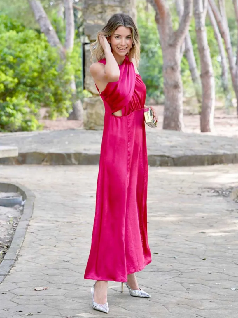 Vestido midi fabricado en tejido satinado disponible en tono fucsia y azul. Con diseño de escote asimétrico cruzado con tirantes anchos en la espalda. Su corte es de línea recta entallado en la cintura con un sutil vuelo en la falda. Va cerrado en el lateral con una cremallera invisible.