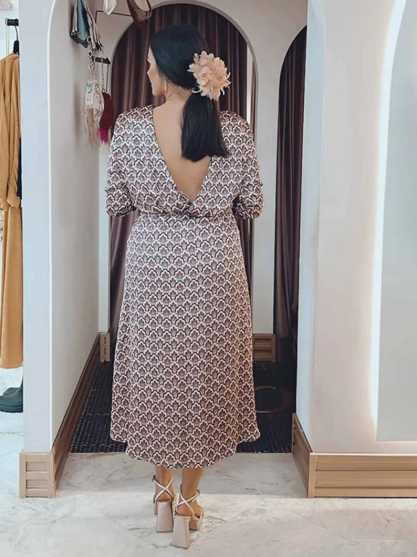 Un detalle atractivo de este vestido es la abertura en el bajo, situada en el lado izquierdo, que aporta un toque de movimiento. El vestido presenta un escote delantero cerrado y cuello redondo, contrastando con un escote trasero abierto en forma de V.