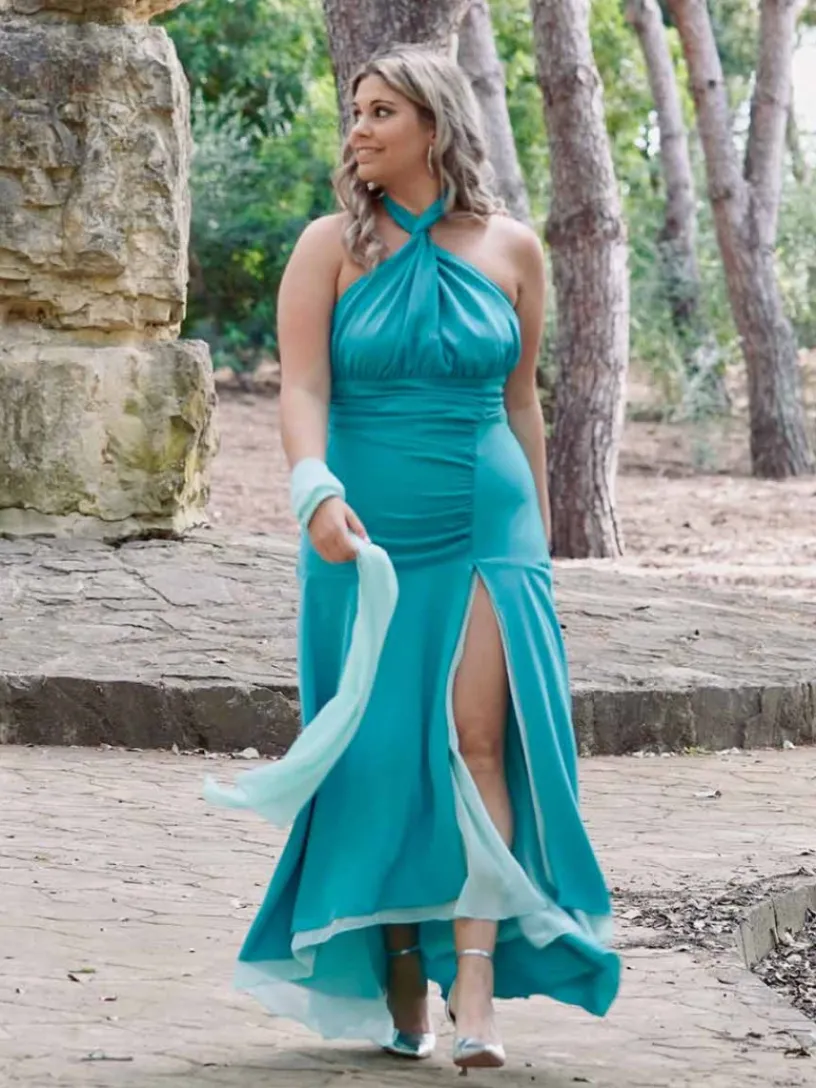 Vestido de fiesta largo con diseño de escote halter, una opción actual que sienta ideal dejando tus hombros al descubierto. Con drapeado en la zona del abdomen que disimulará sutilmente la tripita. Va cerrado con cremallera trasera invisible para un mejor ajuste, y, su lazada multiposición podrás ajustarla como más te guste.