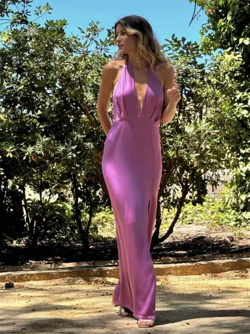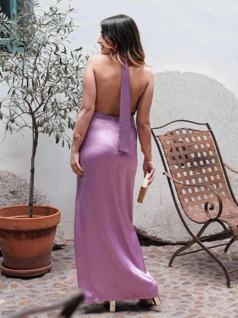 Vestido largo de invitada confeccionado en tejido de viscosa satinada que lo hace aún más elegante. Con escote pronunciado en V anudado al cuello y espalda descubierta. Cerrado con cremallera trasera invisible en la zona de la falda.