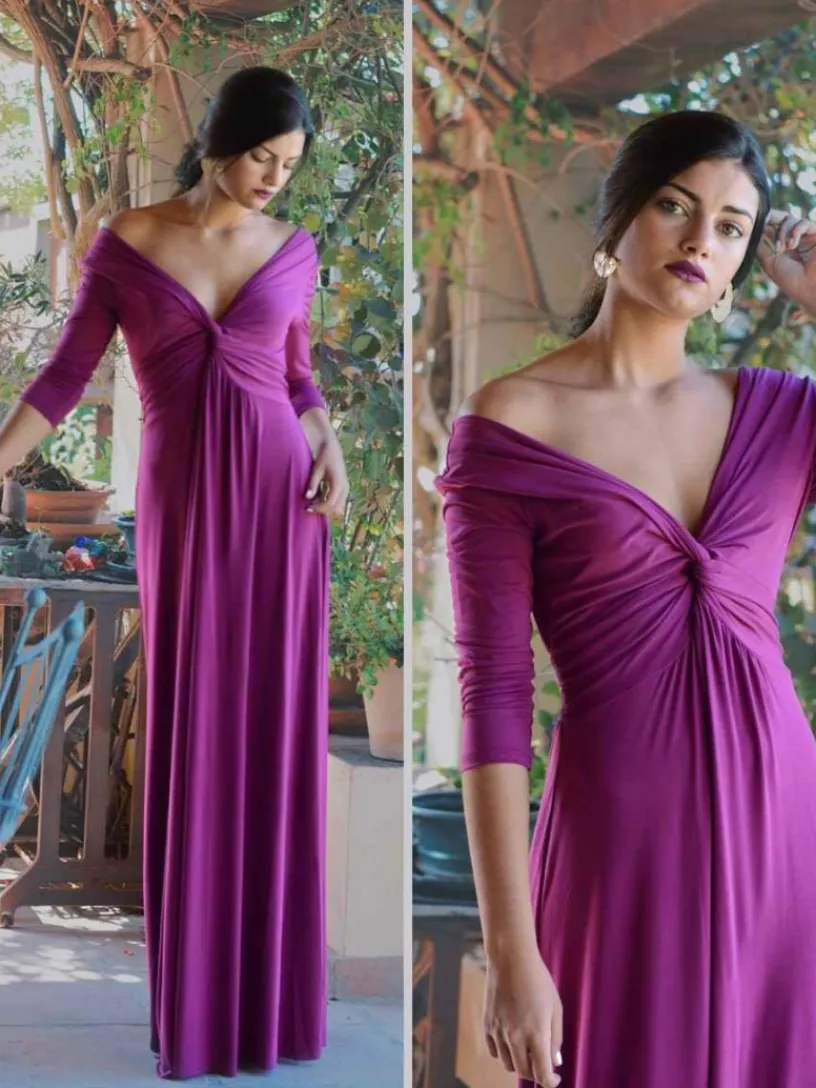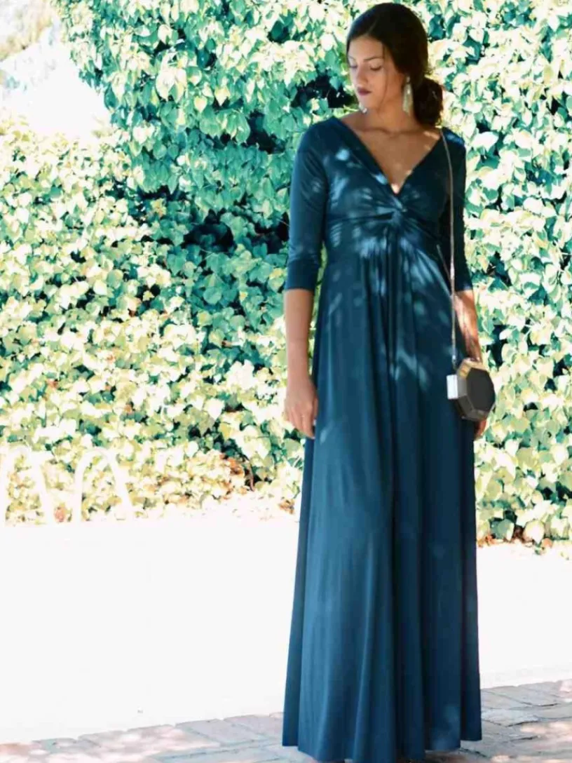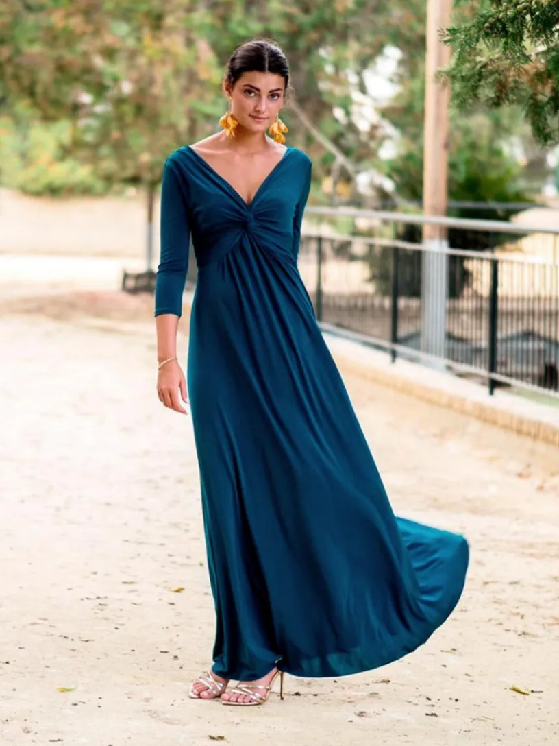 Este vestido de fiesta largo está confeccionado en punto sedoso con mucha caída. Este vestido de noche es todo un clásico renovado, después del Vestido Nudo Adriana, ahora os traemos la versión con mangas largas. Este vestido, al presentarse con escote en V coronado por un nudo, hace que tu silueta se afina visualmente. Podrás lucir su escote como prefieras, de la forma más clásica o un poco más abierta enseñando los hombros.