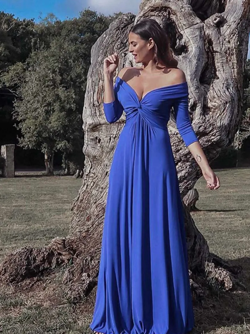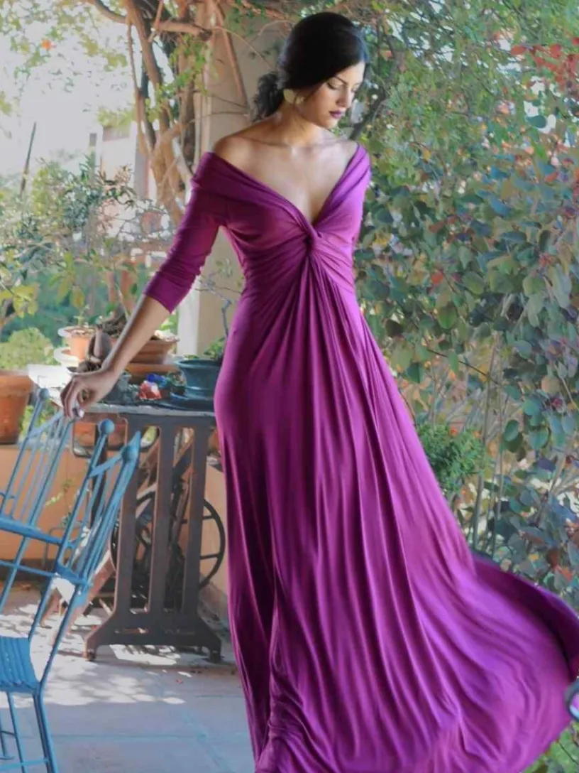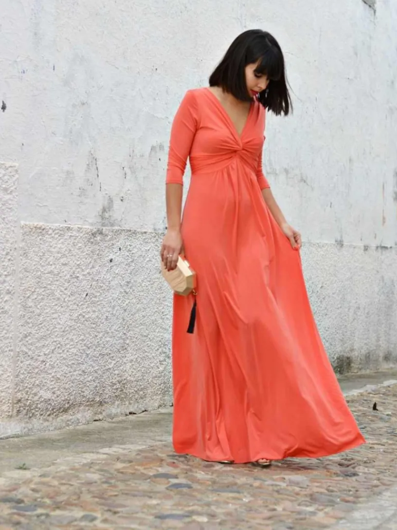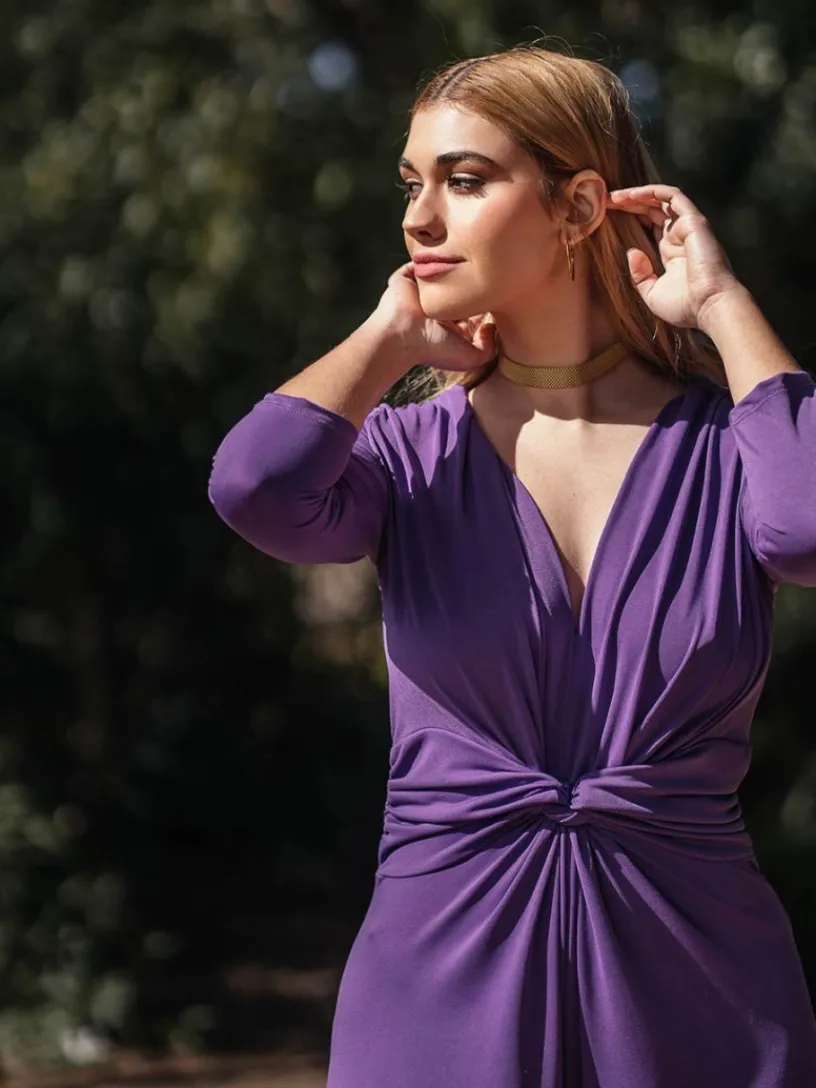 Este vestido de fiesta largo está confeccionado en punto sedoso con mucha caída. Este vestido de noche es todo un clásico renovado, después del Vestido Nudo Adriana, ahora os traemos la versión con mangas largas. Este vestido, al presentarse con escote en V coronado por un nudo, hace que tu silueta se afina visualmente. Podrás lucir su escote como prefieras, de la forma más clásica o un poco más abierta enseñando los hombros.