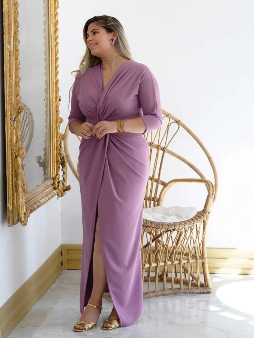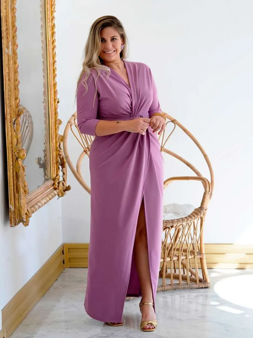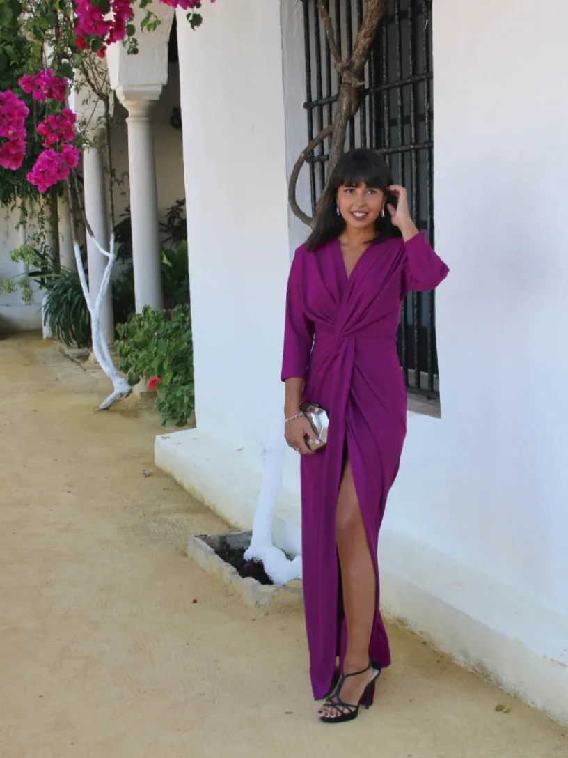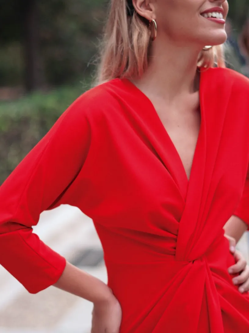 Este vestido de invitada tiene un pronunciado escote en forma de V que se cruza con un nudo debajo del pecho que acentúa tu cintura y realza tu figura. Está confeccionado en punto con el porcentaje justo de elastano para que se adapte a todo tipo de siluetas. El detalle de la manga francesa siempre es un acierto por el toque elegante que le añade al vestido. La falda es de corte recto, se presenta cruzada por delante dejando una abertura para que tus piernas luzcan al andar, aportándole un toque muy sexy a tu look.