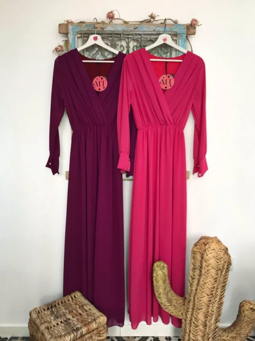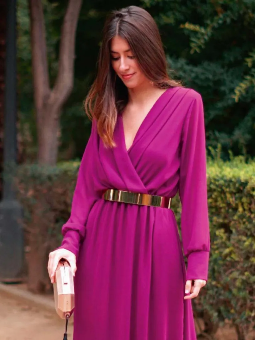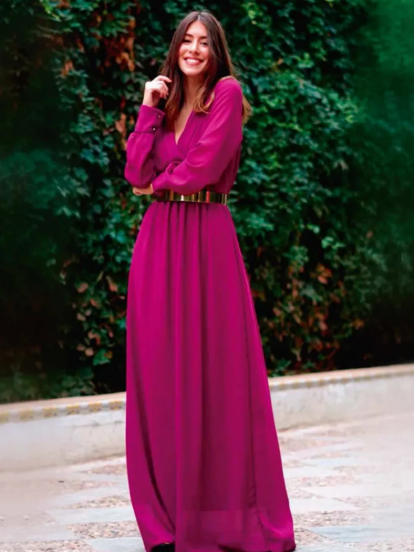 Nuestro vestido de fiesta largo es perfecto para ir elegante a cualquier evento. Está confeccionado en un tejido similar a la gasa, con forro interior a tono. Su precioso escote en V y su corte acentúan tu cintura y realzan tu figura. Además, tiene una caída preciosa y unos puños anchos con unos pequeños botones dorados que te convertirán en la invitada perfecta en las bodas de noche.