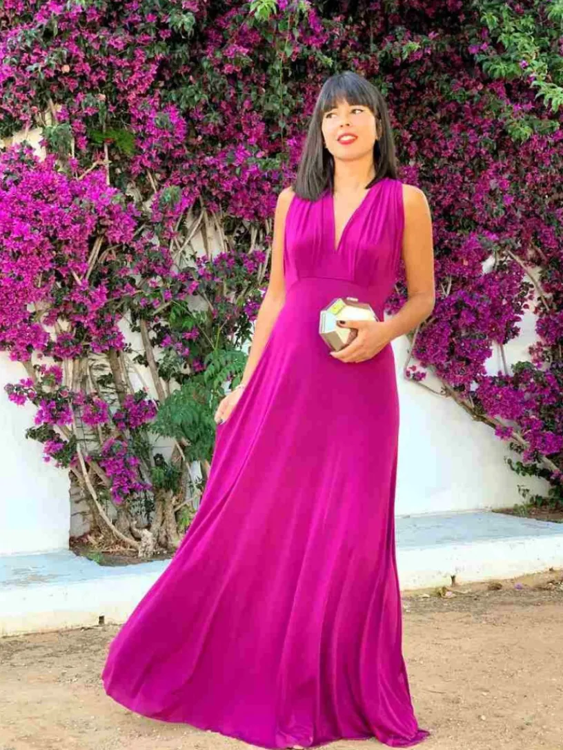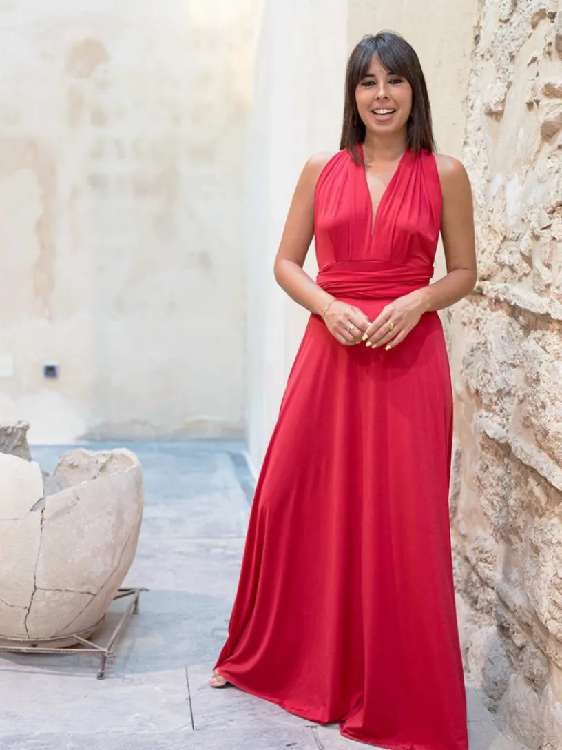 Nuestro vestido de fiesta está confeccionado en un tejido de punto con mucha caída y corte en capa, su escote sencillo en forma de V atado al cuello, eso dependiendo de la posición que le queramos dar, puedes atarlo de mil posiciones diferentes. Es divertido usarlo en cada ocasión de alguna forma donde la imaginación nos lleve, o te puedes ayudar de algún tutorial buscando vestido multiposición, ¡eso sí!, quédate con el nuestro que es perfecto en su calidad y ni contar con el precio que tiene este espectacular vestido largo.