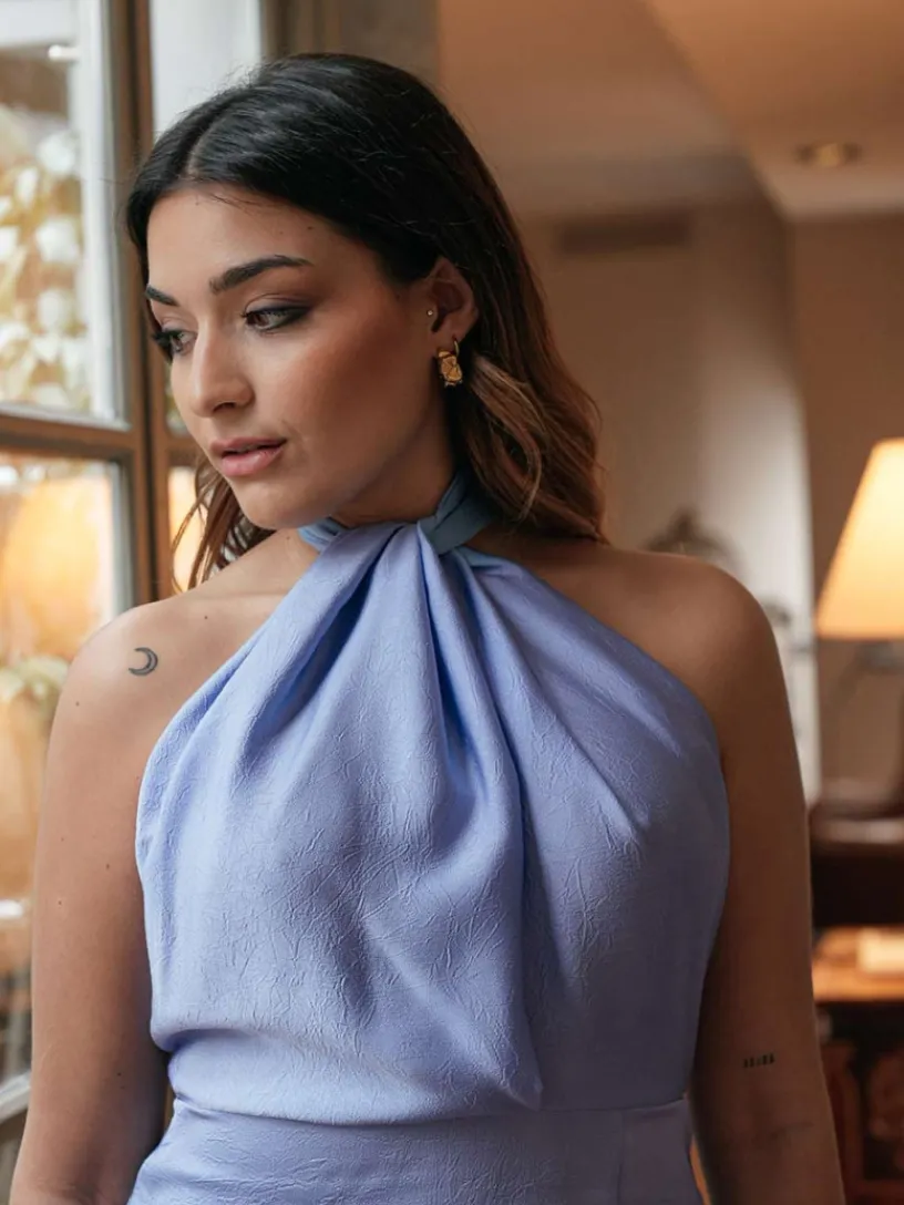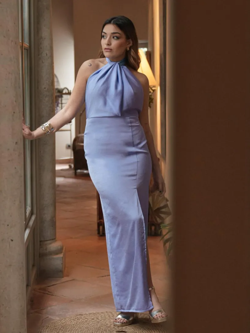 El Vestido Largo Nudo Halter es un vestido de invitada perfecto para eventos tanto de día como de noche gracias a su corte midi-largo.