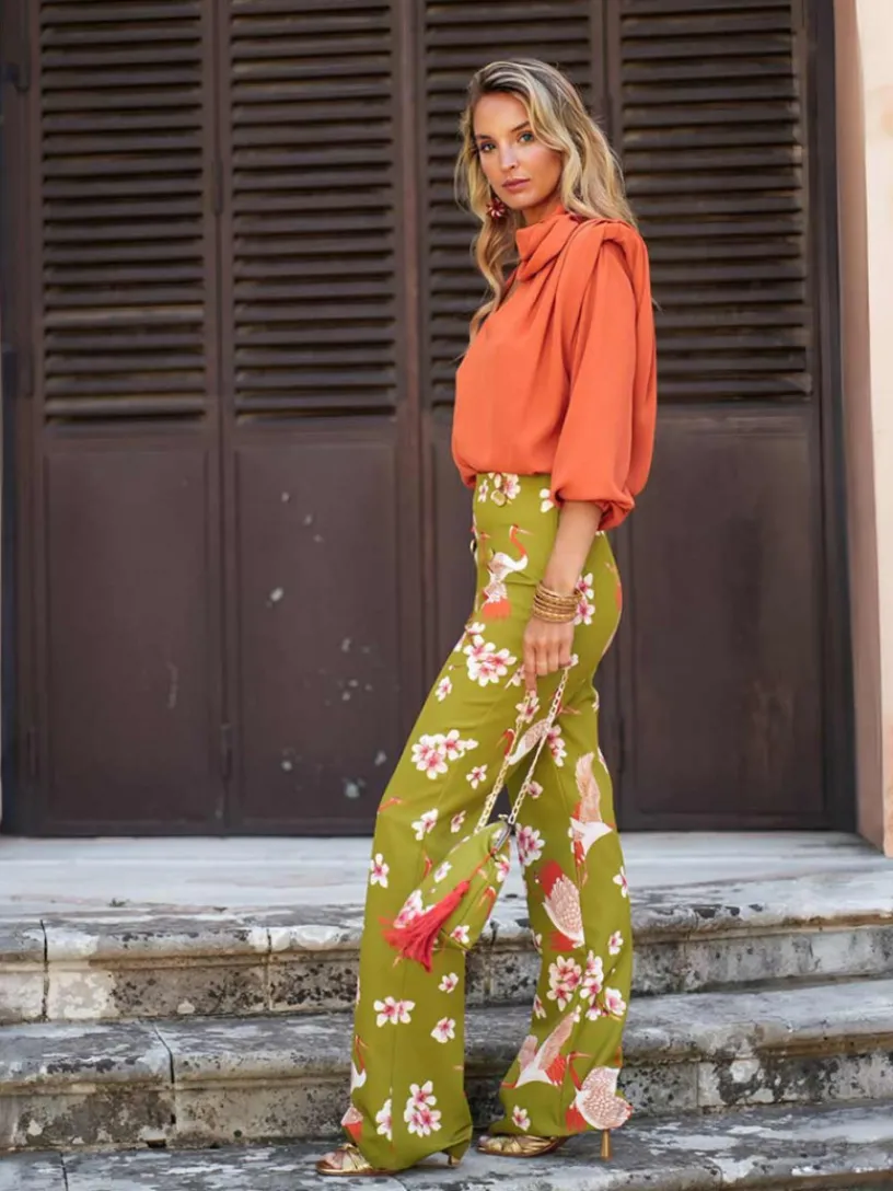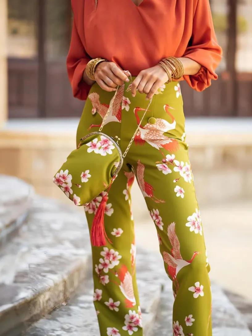 Déjate seducir por el Pantalón Aove Provenza, una pieza única de Mariquita Trasquilá. Su estampado exclusivo, diseñado por nuestro equipo, captura la delicadeza de una grulla en tonalidades calabaza sobre un fondo verde oliva, complementado con elegantes flores de almendro. Cremallera lateral.