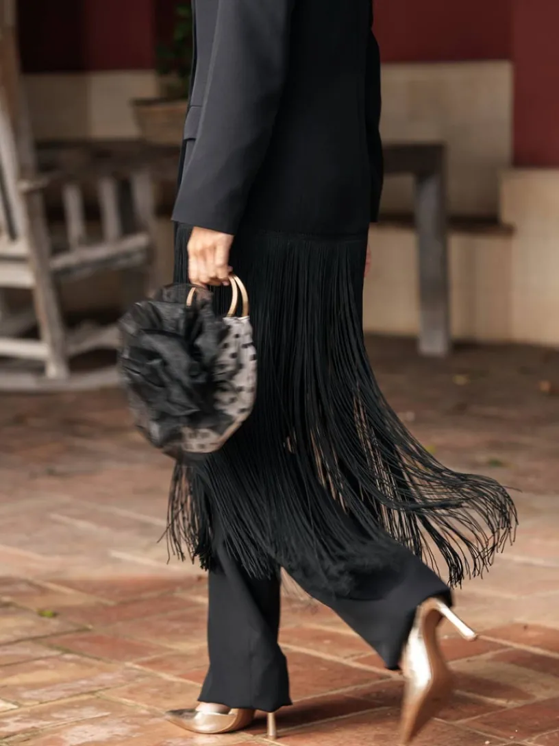 La blazer larga es la clave de este conjunto de invitada. Su diseño se ve enriquecido con el añadido de flecos largos a lo largo de todo el bajo, creando un efecto llamativo. Con cuello tipo solapa, esta blazer combina elementos clásicos con el toque de flecos. Se cierra con dos botones delante, y las hombreras incorporadas ofrecen una silueta estilizada.