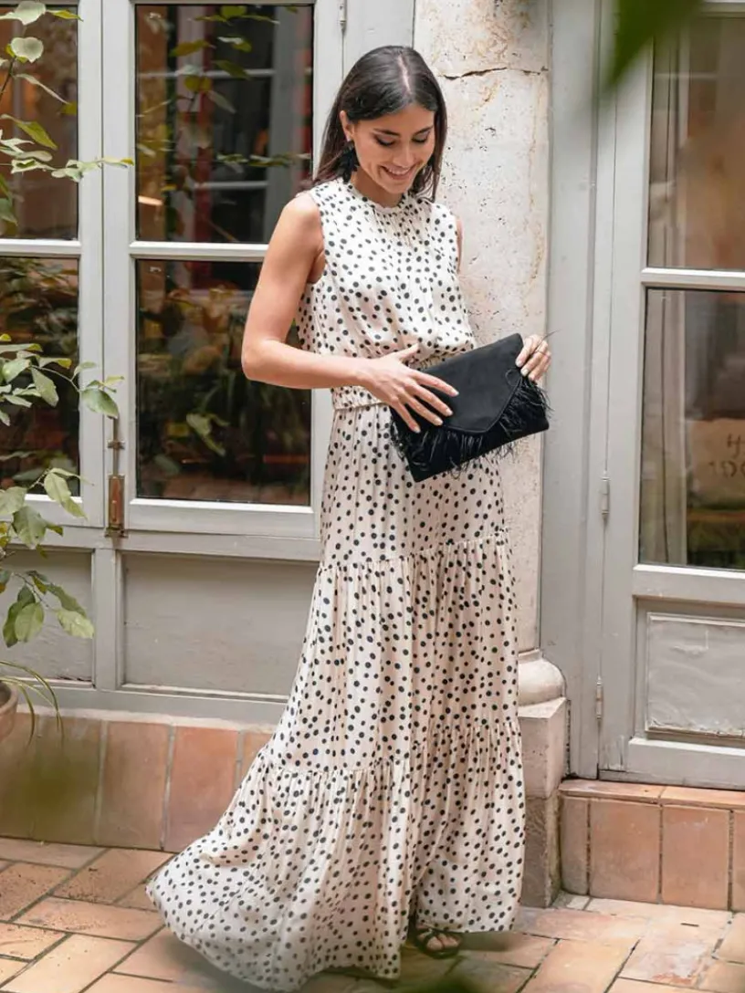 Vestido Jerez. Es un diseño elegante perfecto para vestir en momento especiales esta temporada. Su diseño con estampado de lunares es atemporal y su tejido satinado y fluido será un acierto para que vistas con estilo y cómoda.