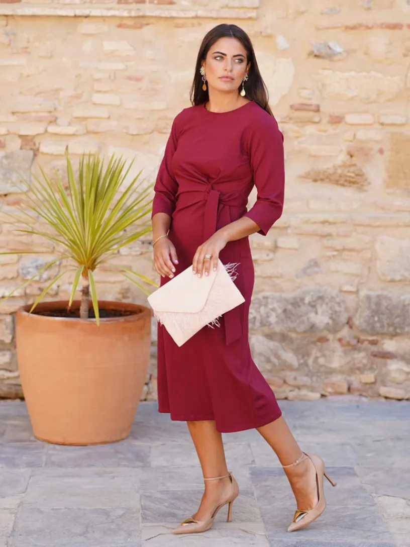 El diseño presenta cuello a la caja que aporta un toque clásico, mientras que la media manga lo hace atemporal. El detalle distintivo de este vestido es la lazada en la cintura, situada en el lateral izquierdo, que permite ajustarloresaltando la silueta de manera sutil.
