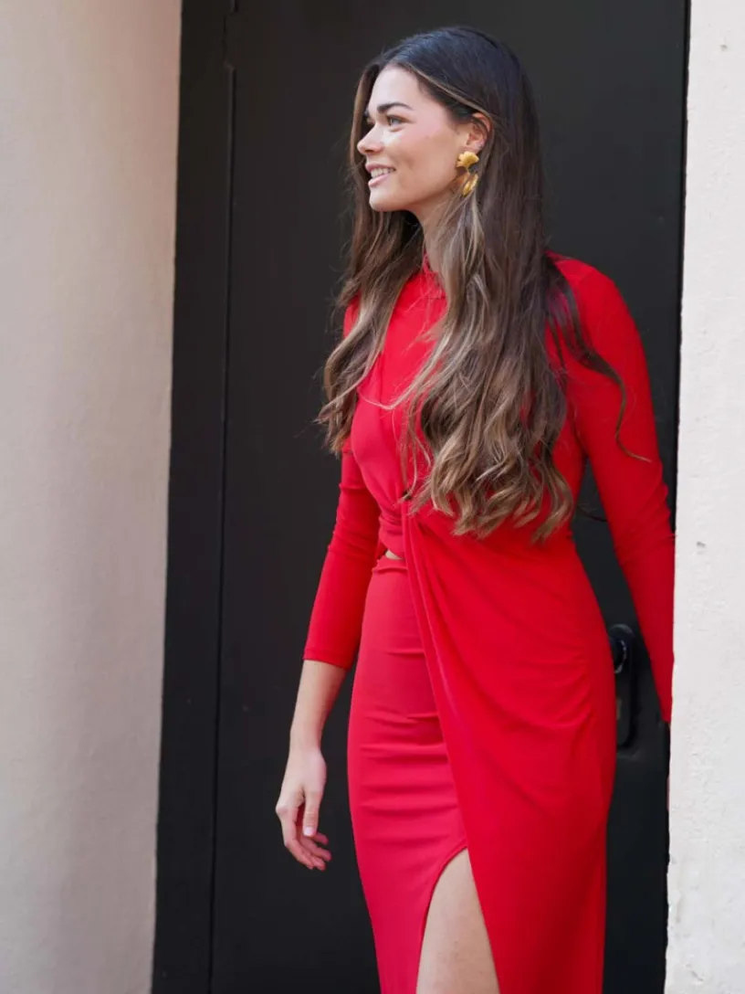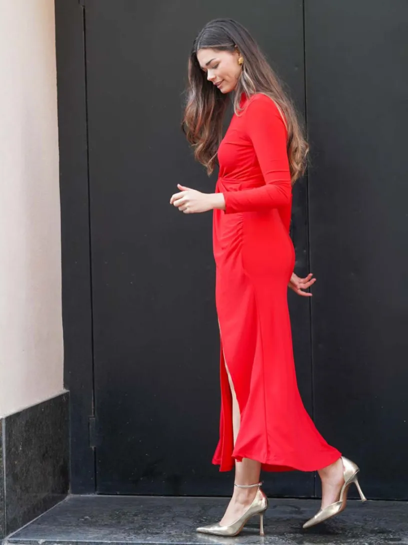 El detalle del nudo central en la cintura aporta un toque único y moderno que estiliza la figura, destacándola de manera elegante y favorecedora. Además, su cuello cerrado y mangas largas lo hacen ideal para lucir en cualquier ocasión, ya sea una cena especial, una celebración de día o incluso un evento informal con un aire chic.