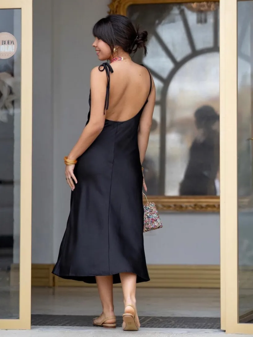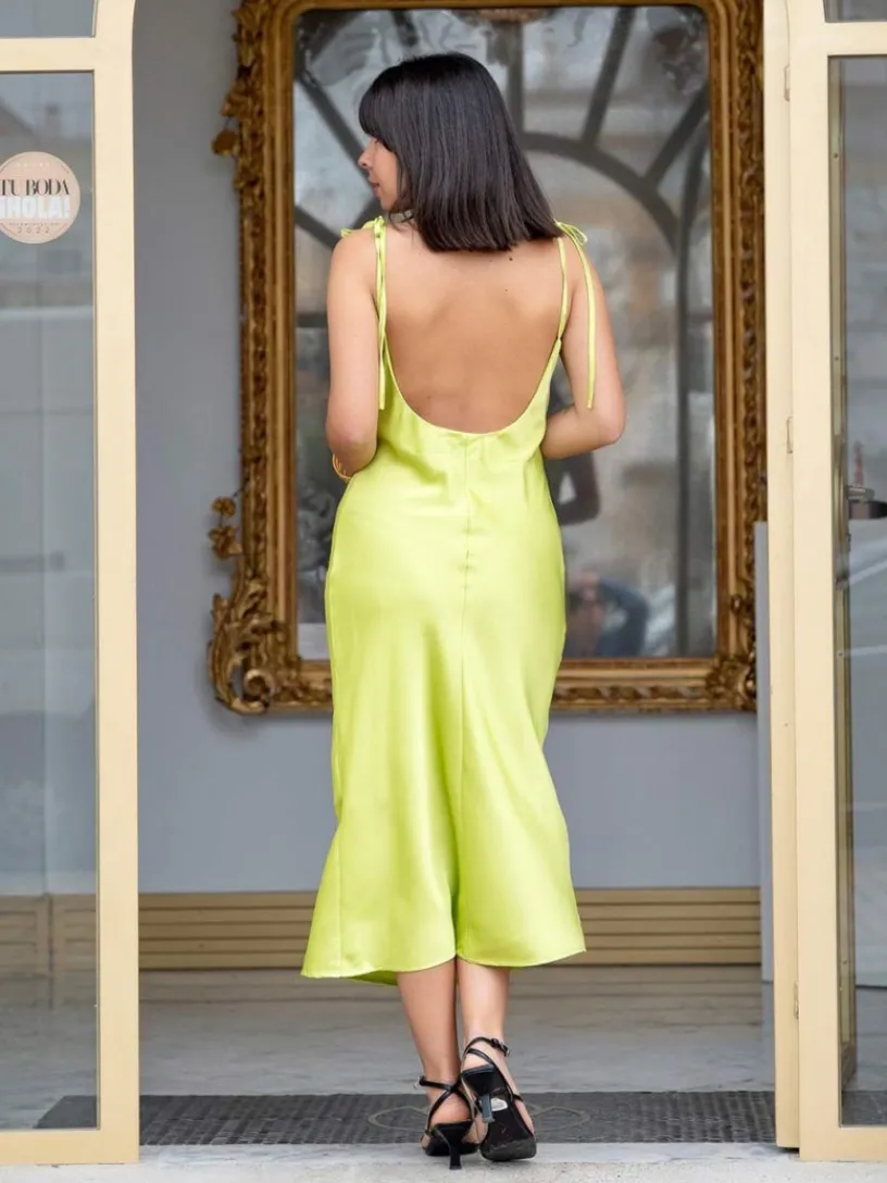 Vestido midi ideal para graduaciones, invitadas jóvenes, feria o incluso para una cena de verano con las amigas. Confeccionado en un tejido tipo satén grueso con forro hasta encima de la rodilla para que no transparente nada y te sientas cómoda en todo momento. Además, gracias a sus tirantes de lazo regulable podrás ponértelo a la altura que más te guste.