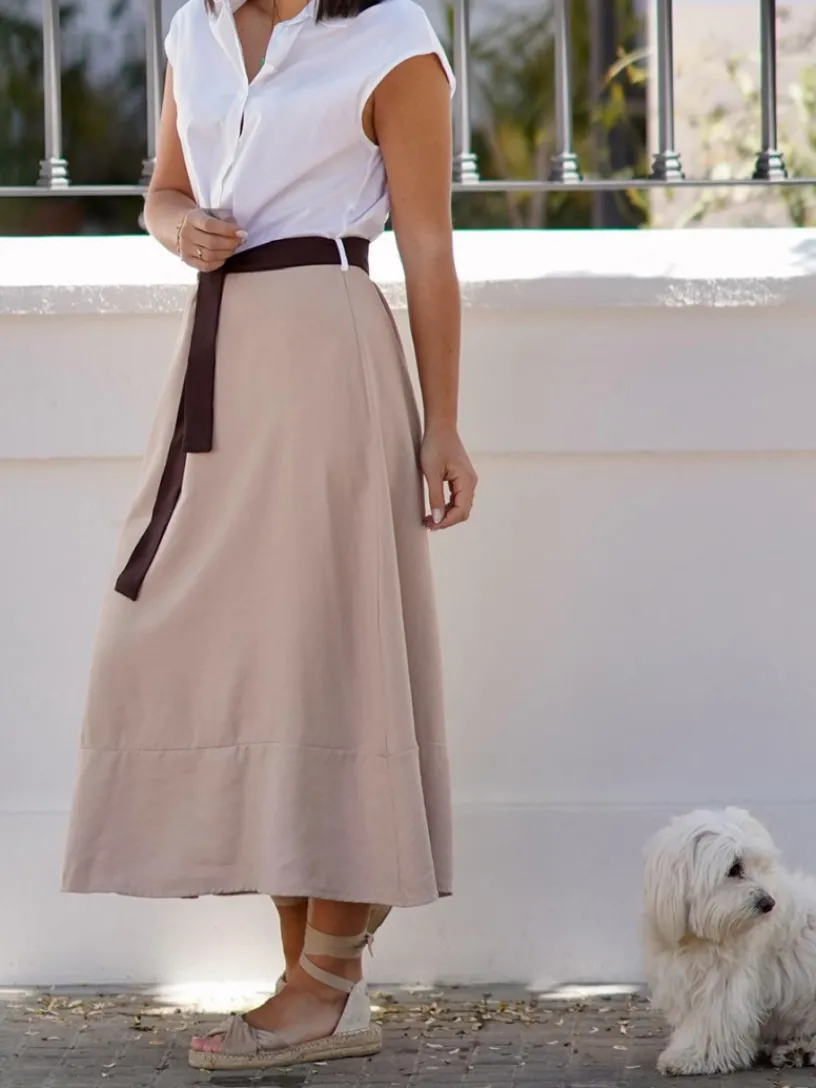 El Vestido Camisero Máxima es el vestido midi que tu armario necesita para darle un toque chic. El cuello clásico le da una apariencia más formal y la manga a la sisa hace que sea perfecto para vestir con estilo en verano.