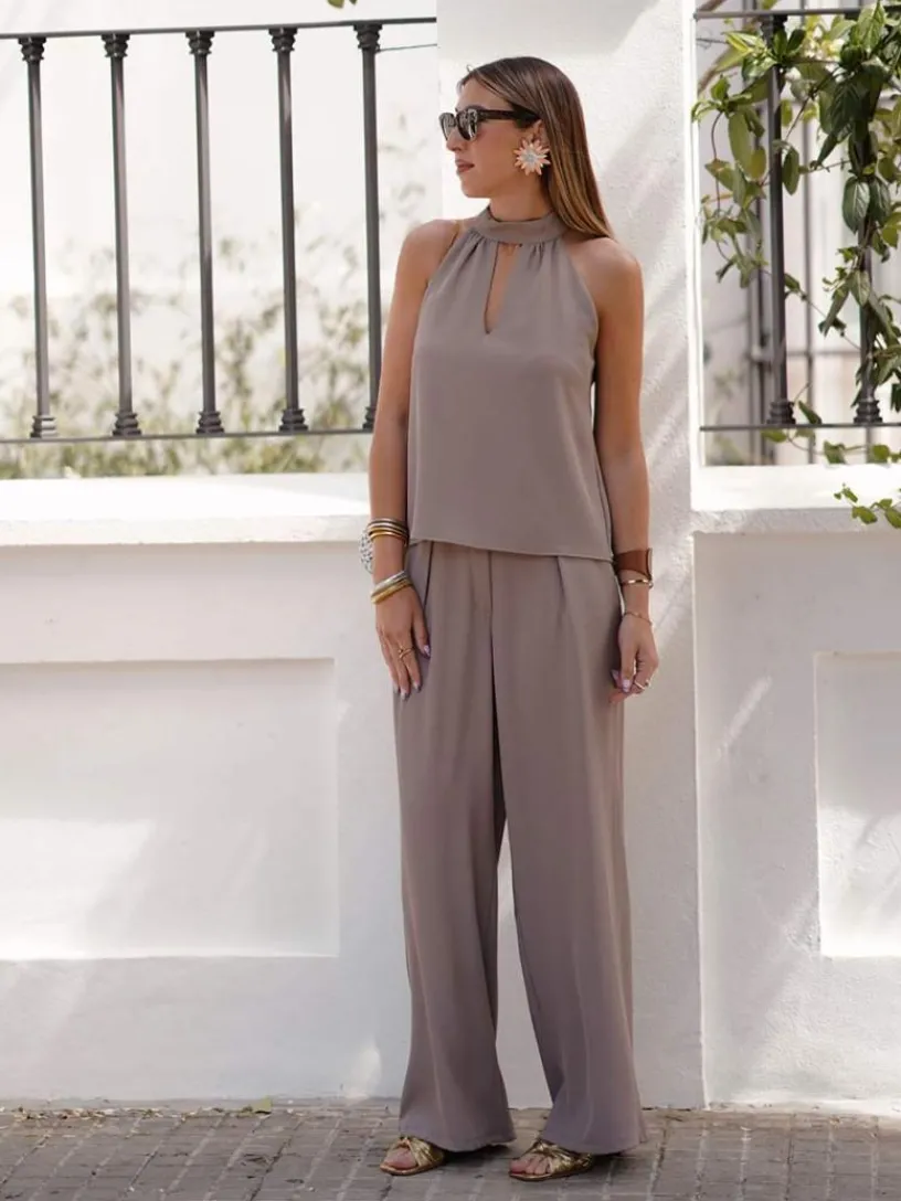 Nuestro conjunto de dos piezas está formado por una blusa con escote halter y manga a la sisa, y, por un pantalón clásico de pinzas con diseño de pierna ancha y bolsillos a cada lado. El pantalón incluye también trabillas por si quieres combinarlo con un cinturón.