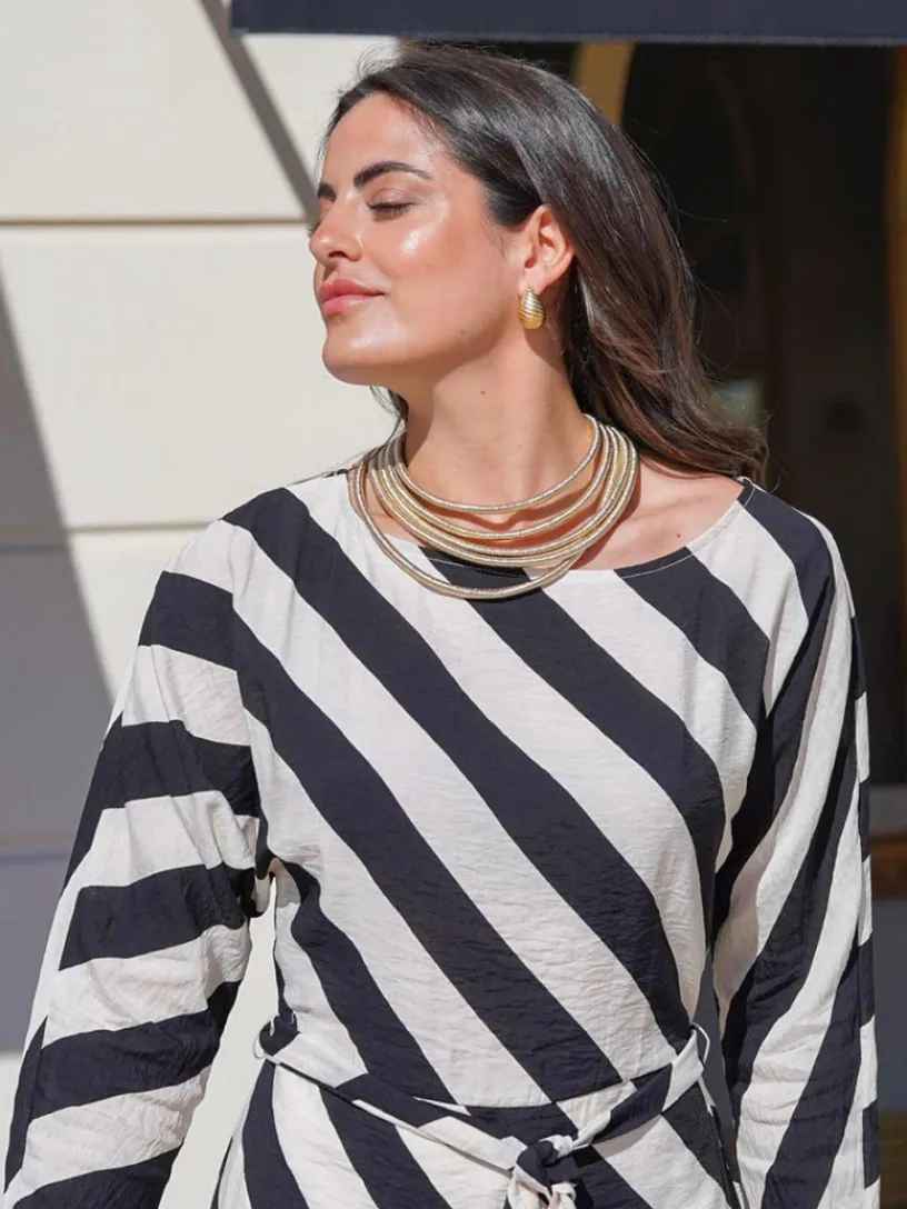 Vestido midi fabricado en tejido crepe con estampado de rayas diagonales Cruela blanco y negro. Con escote de cuello barco y manga francesa para que puedas lucirlo esta primavera. Como detalle, incluye un cinturón del mismo tejido para que puedas ajustarlo a tu cintura. Y, el vestido tiene forro interior para que no transparente nada.