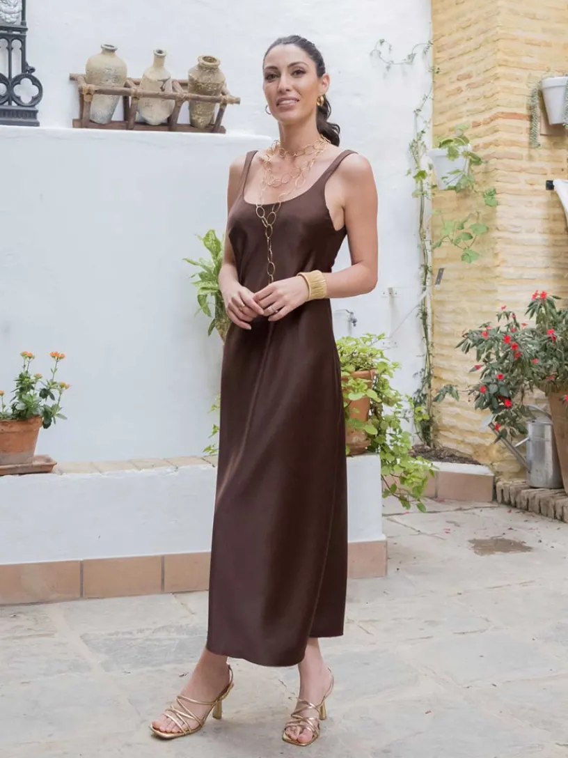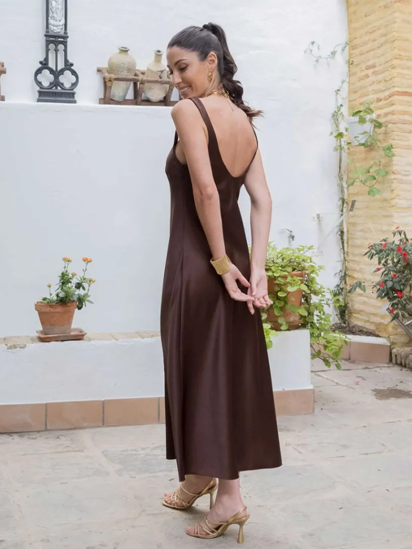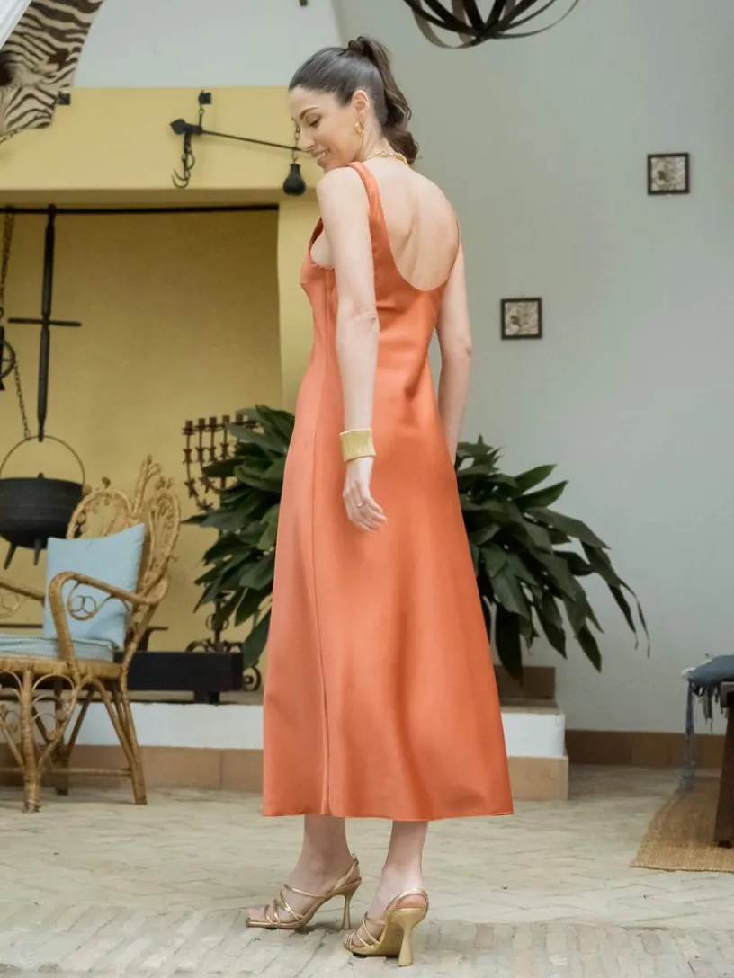 Vestido midi fabricado en tejido satinado fluido y fresco, ideal para vestir con estilo y sin pasar calor tanto en eventos como es una cita especial. Con manga a la sisa y escote redondo tanto delantero como trasero, con pinzas en la zona del pecho que marcan sutilmente la zona y, con diseño de línea recta más abierto en el bajo, muy cómodo ya que no llega a ceñirse al cuerpo.